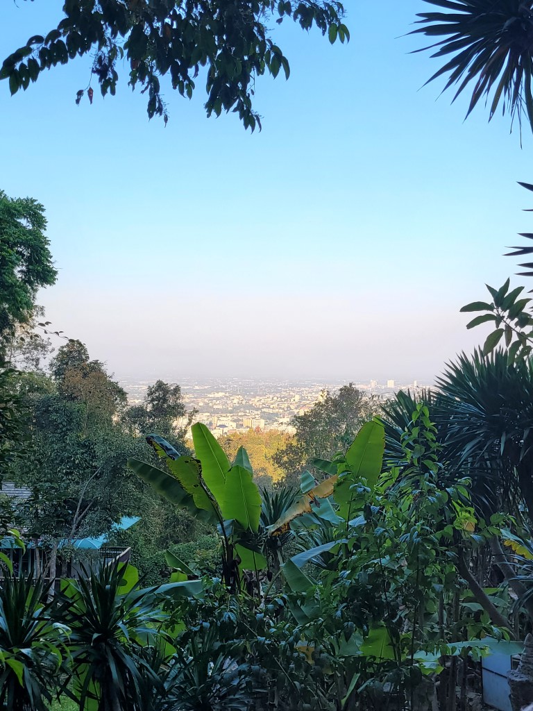 Von der Straße gab es einen kleinen Pfad ins grüne Dickicht welcher ersteinmal bergauf führte, die Richtung sah gut aus und der Pfad war gut sichtbar, sodass wir uns auf den verlassenen Weg getraut haben. Zunächst wurde über das Herumstochern mit Stöcken im Laub und den Büschen diskutiert, welches dazu führte, dass wir weitere 10 Minuten erklären mussten, dass die Schlangen und andere Tiere nicht am Wegrand auf kleine Touristen warten, um sie zu verspeisen. Jede Wurzel, Liane und jedes Stöckchen war eine potenzielle Schlange. Je länger wir auf dem Trail liefen, desto öfter kamen uns Leute entgegen und wir haben festgestellt, dass diese Gegend nicht ganz so verlassen ist, wie es anfangs schien. Die Ruhe war toll und besonders die Luft war spürbar besser. Bei einer Trinkpause haben wir einen blauen Vogel entdeckt, man kann ihn auf dem Foto noch erahnen. Ab und zu gab es ein paar Lücken, durch die man auf die Stadt gucken konnte, der Sonnenuntergang ist nicht in weiter Ferne.