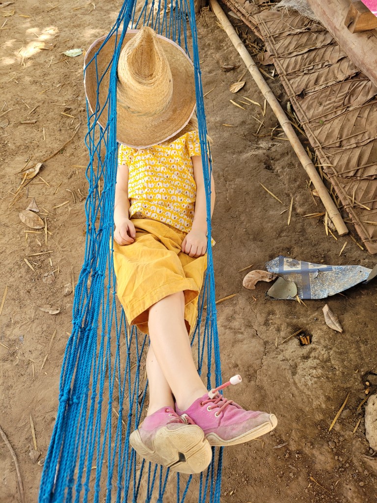 Morgens mussten wir zunächst unser Gepäck einräumen und innerhalb dieser Unterkunft umziehen. Ursprünglich hatten wir zwei Tage in Chiang Rai geplant. Der weiße Tempel in Rai und der Nachtbasar dort sind sehr schön, aber 3 Stunden mit dem Bus entfernt. Wir hatten alle keine Lust auf längere Fahrten, somit haben wir hier unseren Aufenthalt verlängert und haben 2 Umzüge innerhalb vom Haus in Kauf genommen. Wir wissen zumindest, dass wir auch als 5-köpfige Familie ein „kleines“ Zimmer nehmen können. Dank Zustell-Bett und bequemer Couchkissen konnten wir uns genügend Schlafplätze bauen.