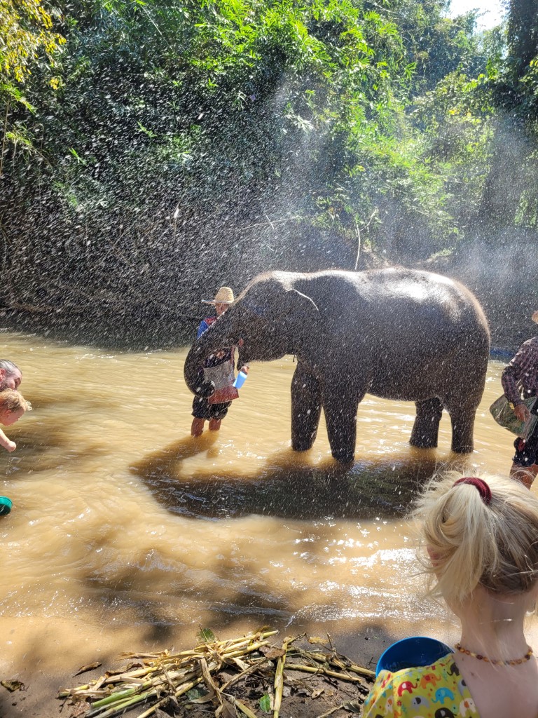 Nach dem Spaziergang gab es ein Mittagessen, die Kinder mochten besonders die Wassermelone 🙂 und dann kam der Teil auf den sich besonders Mali gefreut hat. Das Schlammbad! Die Tiere haben sich mit dem Matsch einreiben lassen, allerdings haben sie uns auch am Schlammbad teilhaben lassen und ihre Rüssel voller Freude in die Höhe gestreckt und die Suppe über sich und uns ausgeblasen. Von oben bis unten besprenkelt ging es auf die gegenüberliegende Seite in den Fluss. Mit einer Schüssel konnte man den Dreck abwaschen. An wem? Hauptsächlich an sich selbst! Die Elefanten haben sich waschen lassen, aber sie hatten mehr Freude daran das Wasser mit ihrem Rüssel zu verteilen. Das Flusswasser ist angenehm kühl, aber die jüngeren Gäste mögen es eventuell nicht unbedingt im Gesicht, wer empfindliche Kinder hat kann zuschauen und im Anschluss baden.