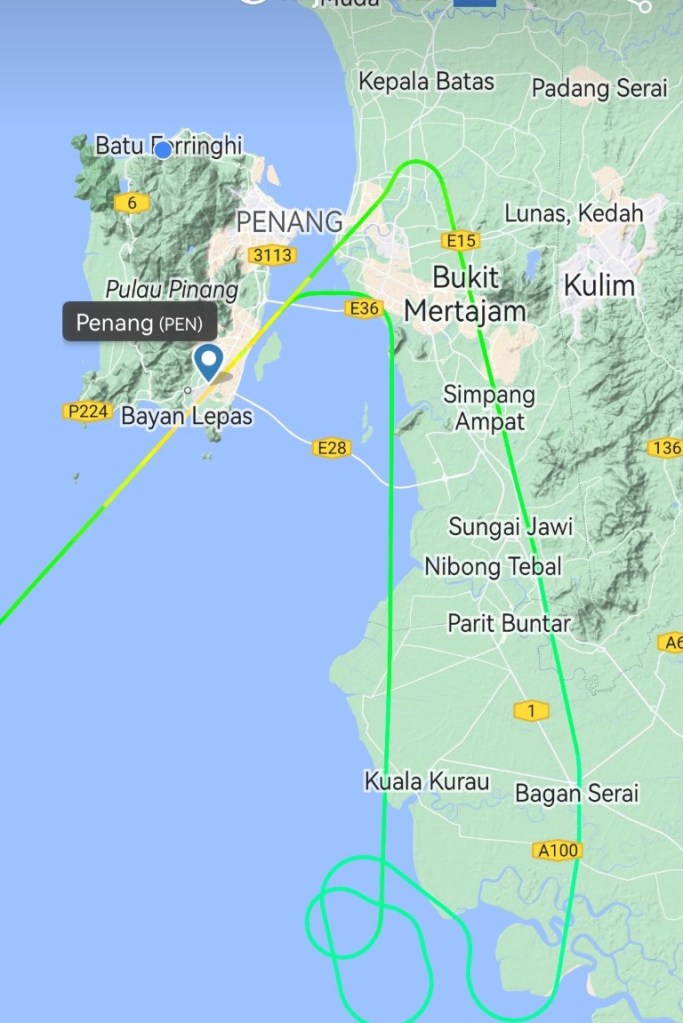 Der Flug verlief abgesehen von ein paar Turbulenzen ganz gut. Im Landeanflug hatten wir eine tolle Sicht auf Penang, kurz vor dem Aufsetzen haben die Turbinen aufgeheult und wir haben wieder an Höhe aufgenommen. Es war einen Moment lang sehr leise im Flieger. Wir sind durch die Wolken, es hat schön gewackelt und wir haben gehofft, dass der Flughafen ein Problem hat und nicht wir. Aus dem Cockpit kam etwa 5 Minuten später auf Indonesisch oder Malayisch die Erklärung. Neben Steffen hat eine Frau gesessen, die es mit Händen gut erklären konnte – Scherwinde. Die Zeit verging und wir flogen und flogen, wahrscheinlich haben wir den ganzen Flugplan in Penang durcheinander gewürfelt. Irgendwann flogen wir in mehreren Kurven scheinbar zurück. Im zweiten Landeversuch in der Gegenrichtung hat die Landung auch gut geklappt. Mein T-Shirt muss in die Wäsche!