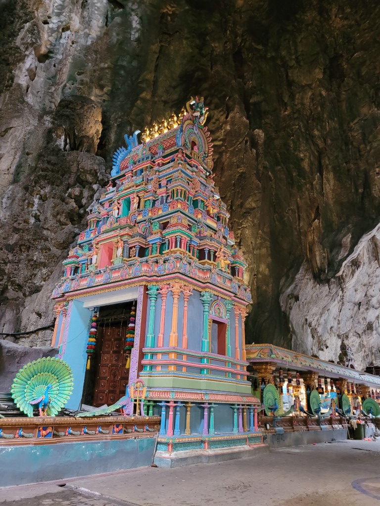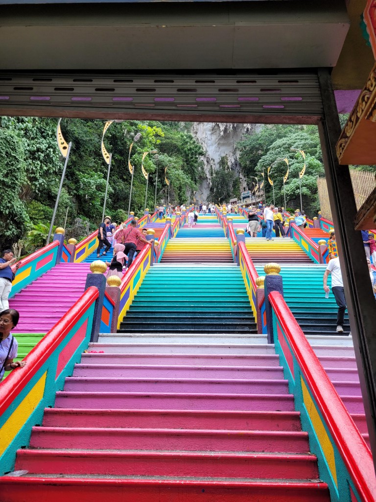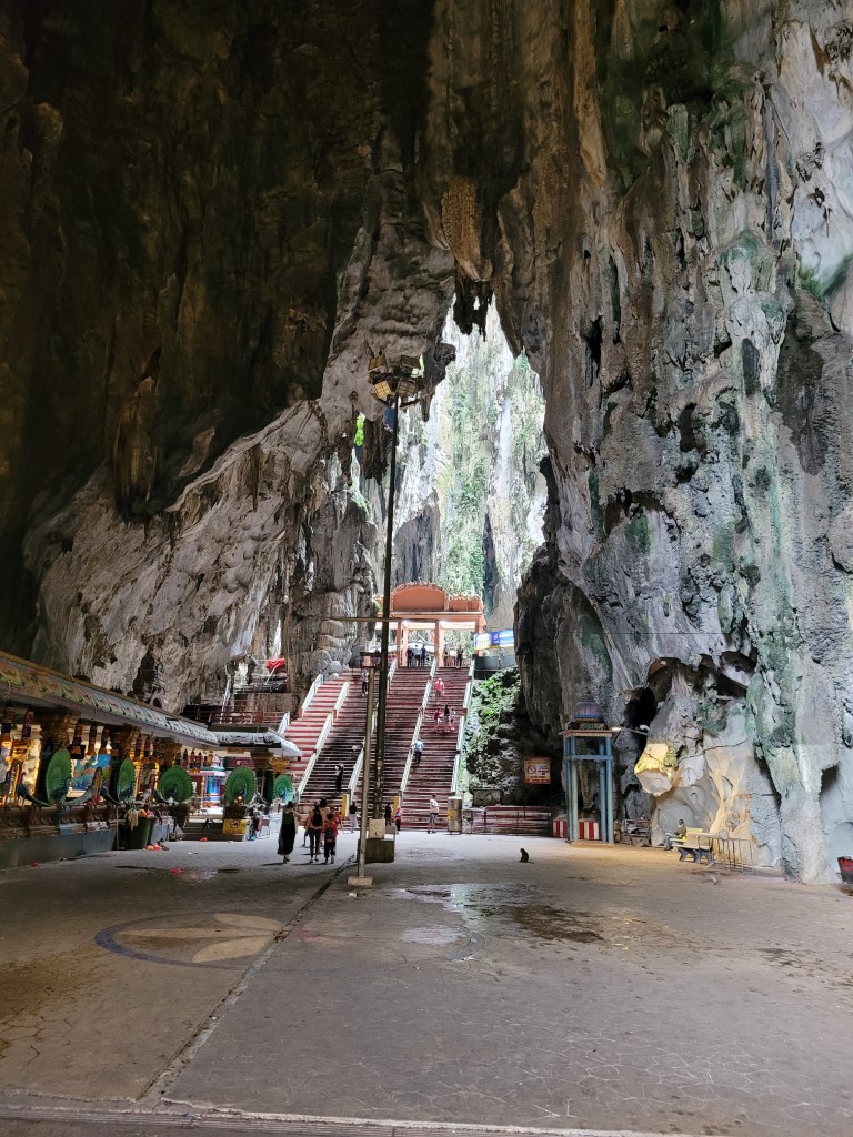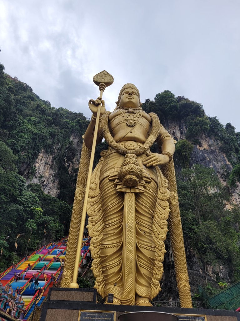 Die Batu Caves lagen auf dem Weg zu unserer Unterkunft, somit haben wir uns diese noch angeschaut, bevor wir unser Auto abgegeben haben. Es hat zum ersten Mal, seit wir unterwegs sind, geregnet. Nach ein paar Minuten Regen war es drückend-warm und wir konnten die 262 Treppenstufen in Angriff nehmen. Die Tempelanlage sieht sehr beeindruckend aus und ist sehr schön bunt. Man darf sich allerdings nicht genauer umschauen. Hinter der großen Statue ist ein Graben voller Müll und auch im Tempel liegt überall Müll herum. Vor den Stufen werden Tauben gefüttert, entsprechend findet man überall die Hinterlassenschaften. Selbst die Affen werden angefüttert und sitzen überall. Auch dieser Tempel ist in einer Tropfsteinhöhle. Die Farbenpracht ist kaum zu übertreffen, die Höhle, die wir in Ipoh besucht haben, war aber schöner, größer und sauberer.
