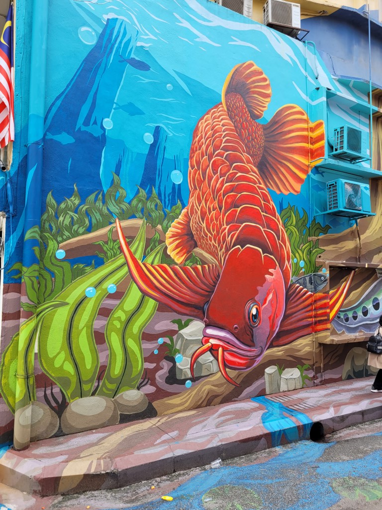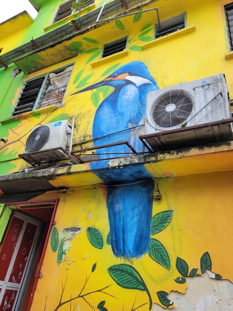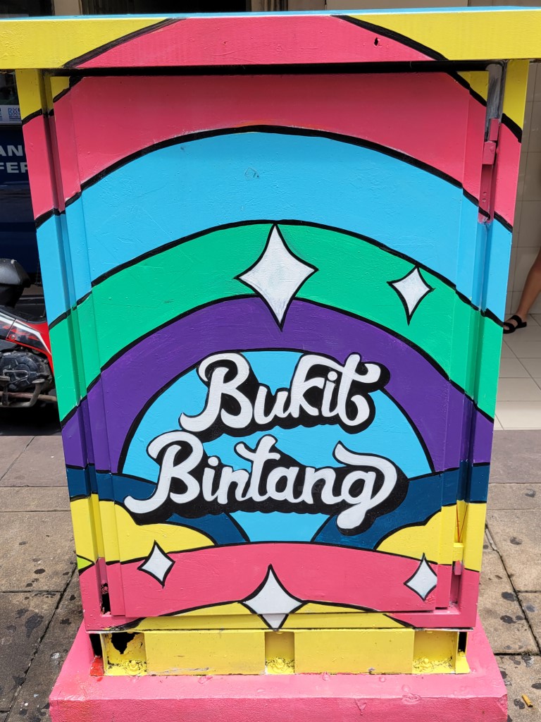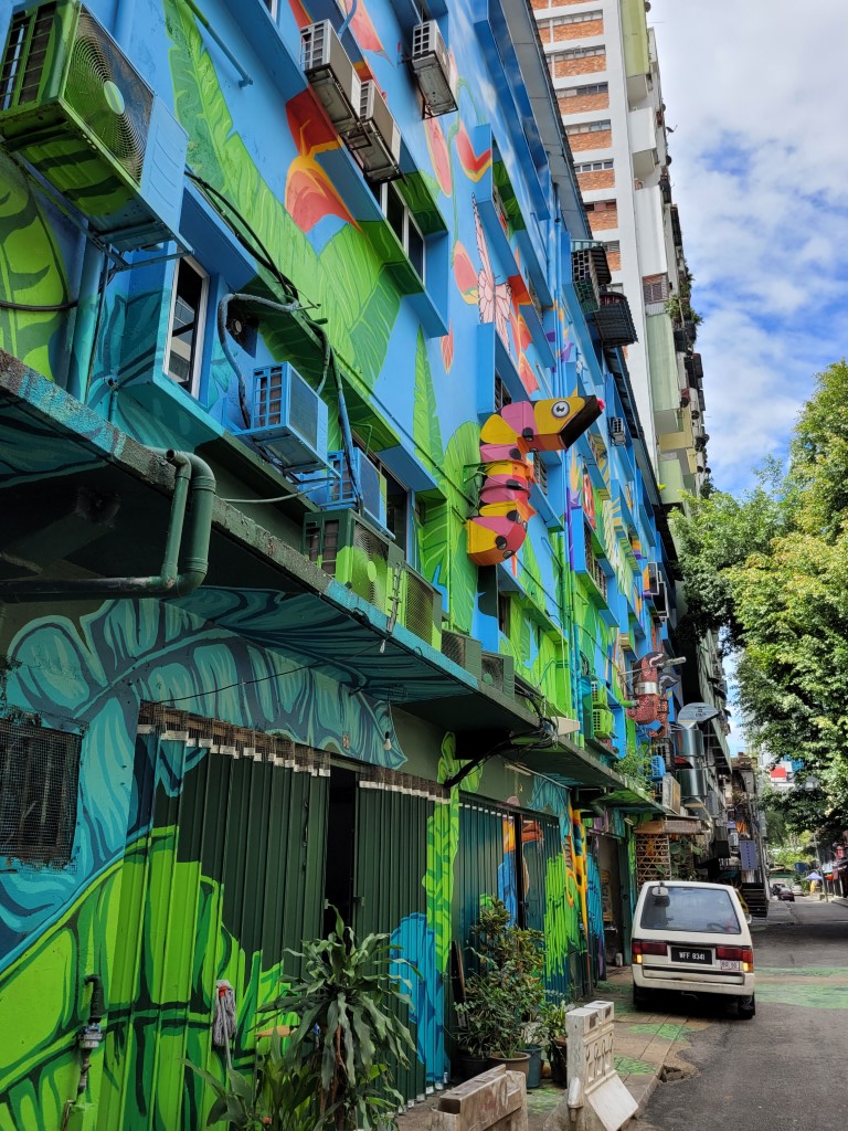 Es hängen zwar Wolken am Himmel, aber hier und da kommt auch Sonne durch. Perfekt für unsere Pläne. Für das Frühstück war ja schon gesorgt, bei den Zutaten sind wir aber bei unserem Standard geblieben und haben nichts exotisches ausprobiert. Mit der Metro sind wir zwei Stationen nach Bukit Bintang gefahren. Zunächst haben wir uns Streetart angeschaut, zumindest bis die Kinder genug hatten, dann gab es das versprochene „beste“ Eis der Stadt. Die Kinder wissen schon, dass wir in Städten erst etwas Sightseeing machen und dann möglichst die Best bewertete Eisdiele aufsuchen. Wir haben sie gefunden, mitten im Künstlerviertel. Wir durften alle Sorten probieren, bevor wir uns entschieden. Der Besitzer hat uns jedenfalls gut beraten und wir ihm als Dank mehr Eis abgekauft, als wir essen wollten (das haben wir erst bei der Portionsgröße bemerkt). Bis zum Abend brauchen wir jedenfalls nichts mehr.
