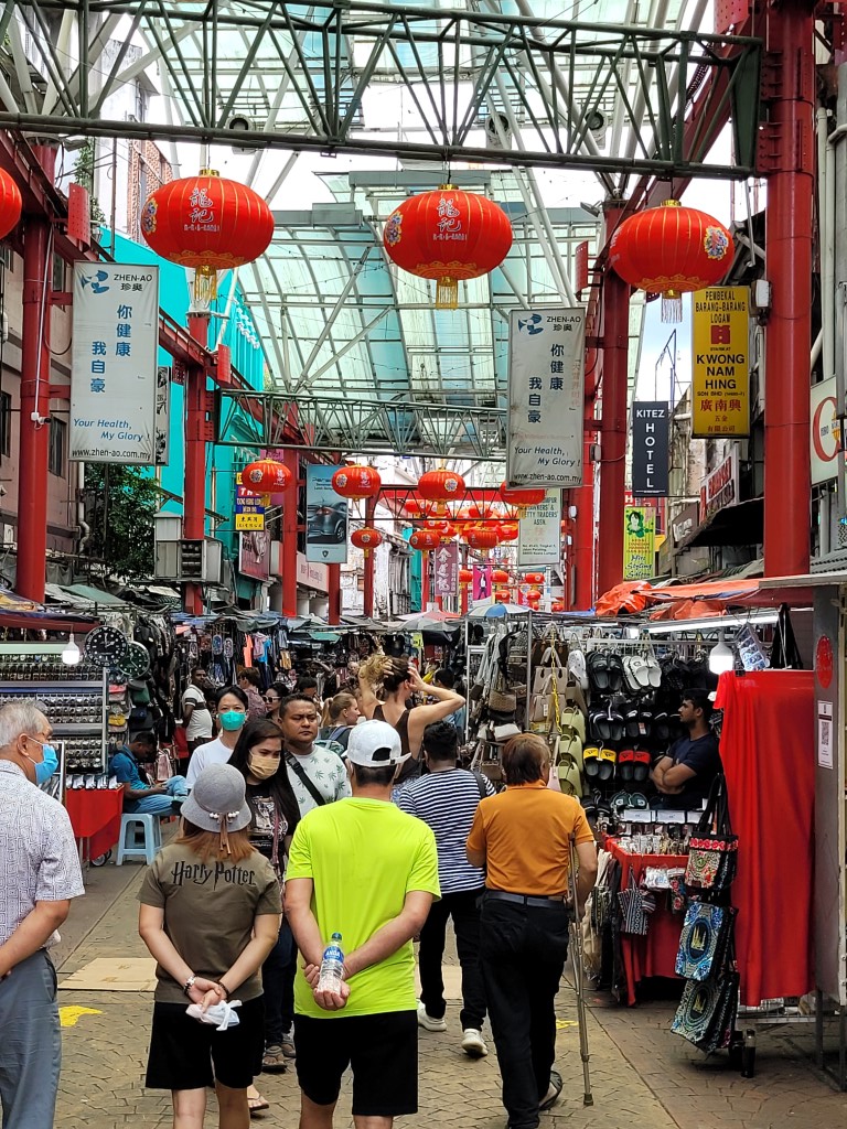 Mit dem Bus wollten wir nach Chinatown fahren. Nach längerer Wartezeit kam auch der richtige Bus, öffnete die Tür, ließ einen Mann einsteigen, schloss die Tür und fuhr kopfschütteld weiter. Okay, in Malaysia hat das mit dem Busfahren nicht wirklich gut geklappt. Zu Fuß sollen es ungefähr 25 Minuten sein. Deutsche erkennt man hier wohl häufig daran, dass sie laufen. Uns wurde an der Eisdiele schon gesagt, „oh ja ihr könnt das laufen, ein Malaye würde sowas niemals tun“. Die Entfernung war auch kein Problem, die Straßensituation ist nur häufig schlecht. Unterwegs war der Bürgersteig einfach zu Ende, dann kam eine Baustelle, die direkt auf die große 3-spurige Straße führte. Man konnte sich zwischen den wild abgestellten Motorrollern hindurchschlängeln und die Baustelle irgendwie umgehen, aber Fußgängerampeln fehlen auch eindeutig. Wir kamen an. Meru, der sonst immer trödelt, ist über die Verkaufsmeile geeilt, weil er auf keinen Fall den Morgenkreis verpassen wollte.