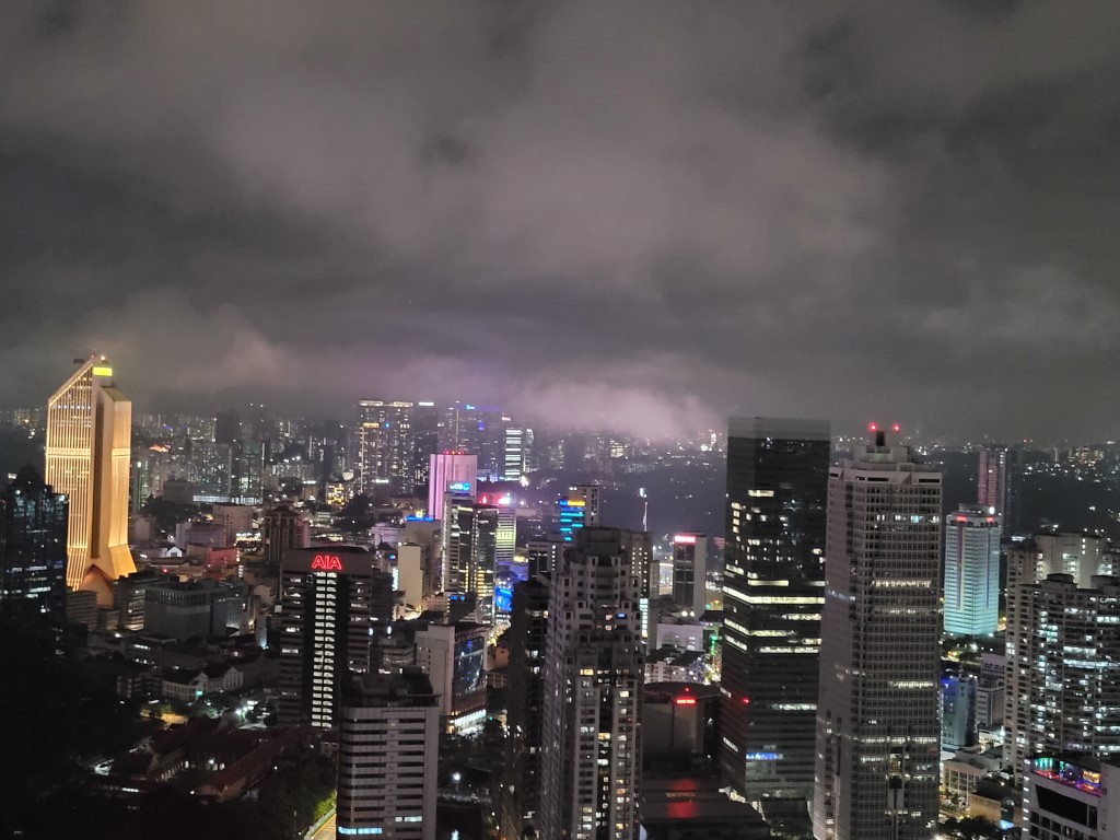 Das Packen konnten wir in aller Ruhe erledigen, es hat geregnet als hätte jemand die Dusche angestellt. Die 19 Uhr Show rückte immer näher, die dunklen Wolken auch bzw. es kam ständig Nachschub. Wir haben uns erstmal zwei „Not-Suppen“ geteilt und die Passionfrüchte aufgegessen. Es war keine Wetterbesserung in Sicht und wir haben beschlossen, hier in der Sky Bar Deepblue wenigstens die Aussicht zu genießen und etwas zu trinken. Zu den Getränken haben sich noch Pizza und Pommes verirrt und vier Desserts ;-). Es sind sehr coole Fotos entstanden, da die Wolken von den Gebäuden teilweise angestrahlt wurden. Viel zu spät sind wir aufs Zimmer und ins Bett. Morgen geht es um 5:45 Uhr aus den Laken.