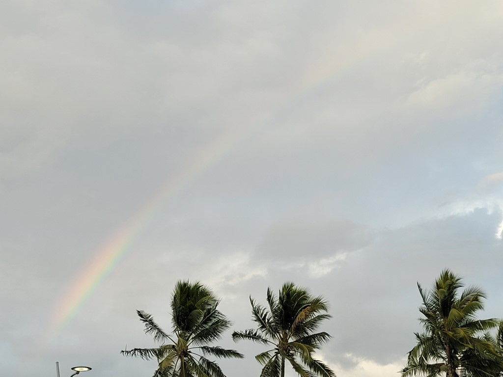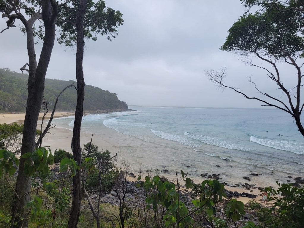 Ich bin ohne Schuhe los und wollte möglichst viel am Strand laufen. Die Regenwolken haben sich schön am Himmel abgezeichnet und die Kulisse sah einfach unfassbar schön aus. Es hat immer wieder angefangen zu nieseln, aber bei den Temperaturen war mir das sehr recht. Am Strand war gar nichts los. Im Wasser lagen ein paar Surfer und haben super Wellen gehabt. Hätte ich das gewusst, wäre es den Aufwand doch wert gewesen. Andererseits hatte ich selten so eine schöne Laufstrecke. Nachdem ich den Strand auf und abgelaufen bin, gings noch in den Nationalpark gelaufen. Der Weg war anfangs betoniert, das war barfuß nicht so super, aber später kam Waldboden mit Sand. Hinter jeder Kurve kam eine noch bessere Aussicht. Koalas und Delfine habe ich leider nicht gesehen. Die gesamte Strecke hatte ich immer die Sicht runter auf den Pazifik und habe supergute Surfer/-innen gesehen. Irgendwann wurde der Weg zu pieksig und die Regenfront sah beeindruckend dunkel aus.