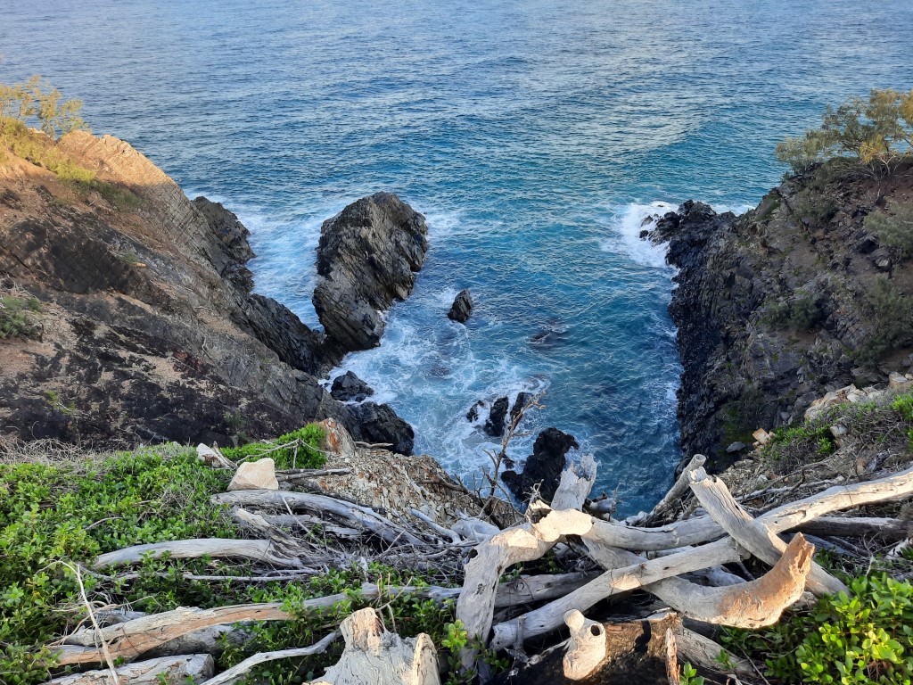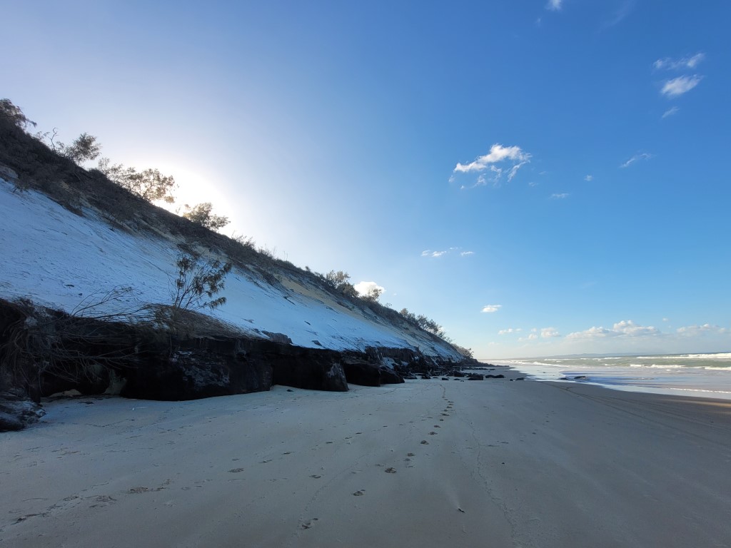 Nachdem wir unseren Stellplatz bei Tageslicht begutachtet haben, sind wir gleich nach Rainbow Beach, um noch bei Ebbe spazieren zu können. Der kilometerlange Strand war von etwa 20 Leuten besucht. Die Meisten haben sich am Strandzugang aufgehalten und waren entweder angeln oder baden.
