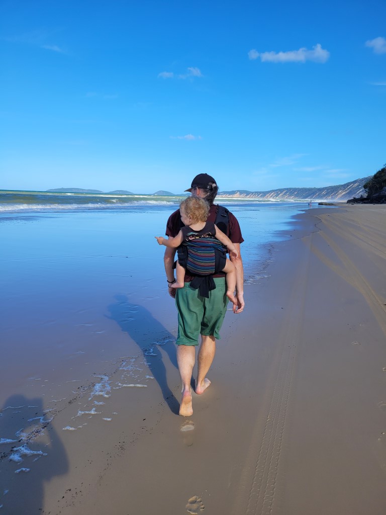 Rio war heute mal in der Trage, und war total glücklich, er hat ständig auf die Wellen oder Vögel gezeigt und hat viel gelacht.