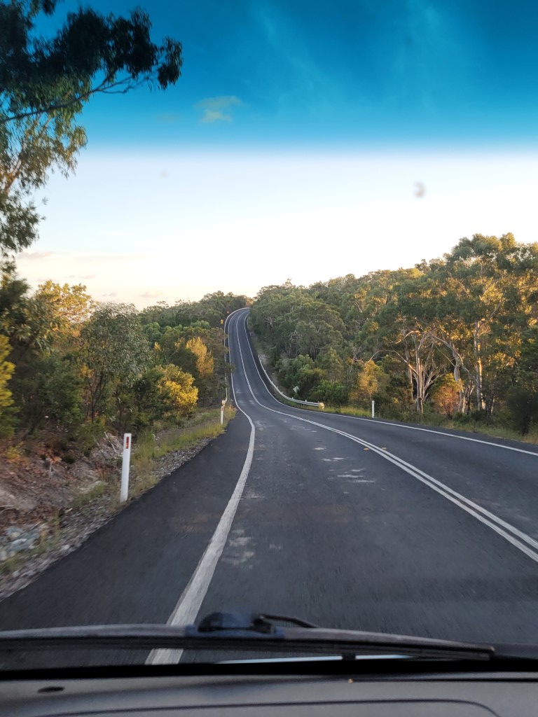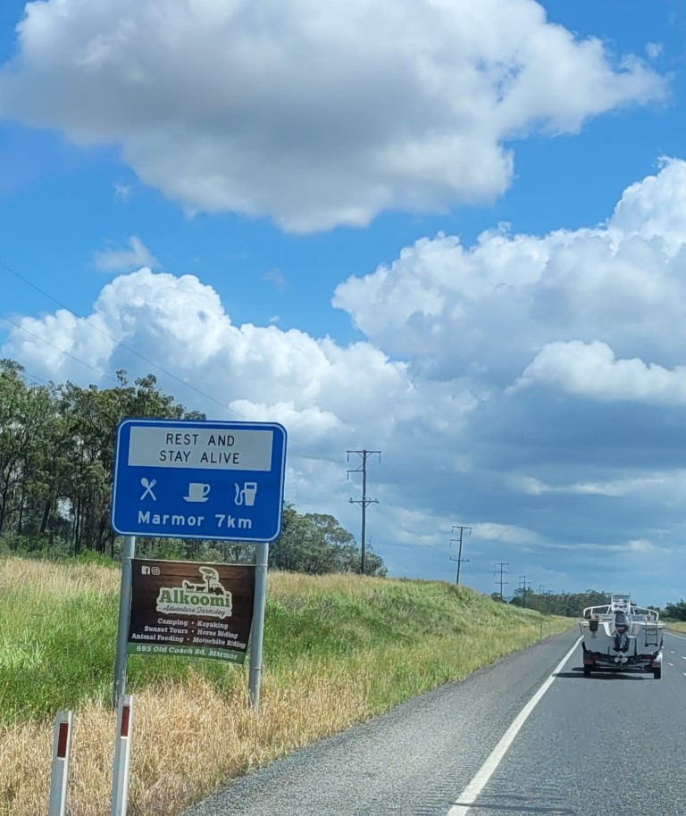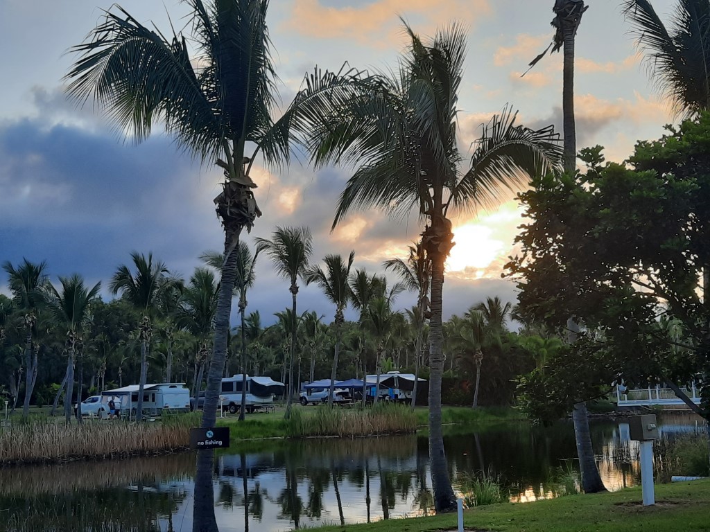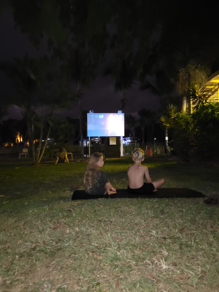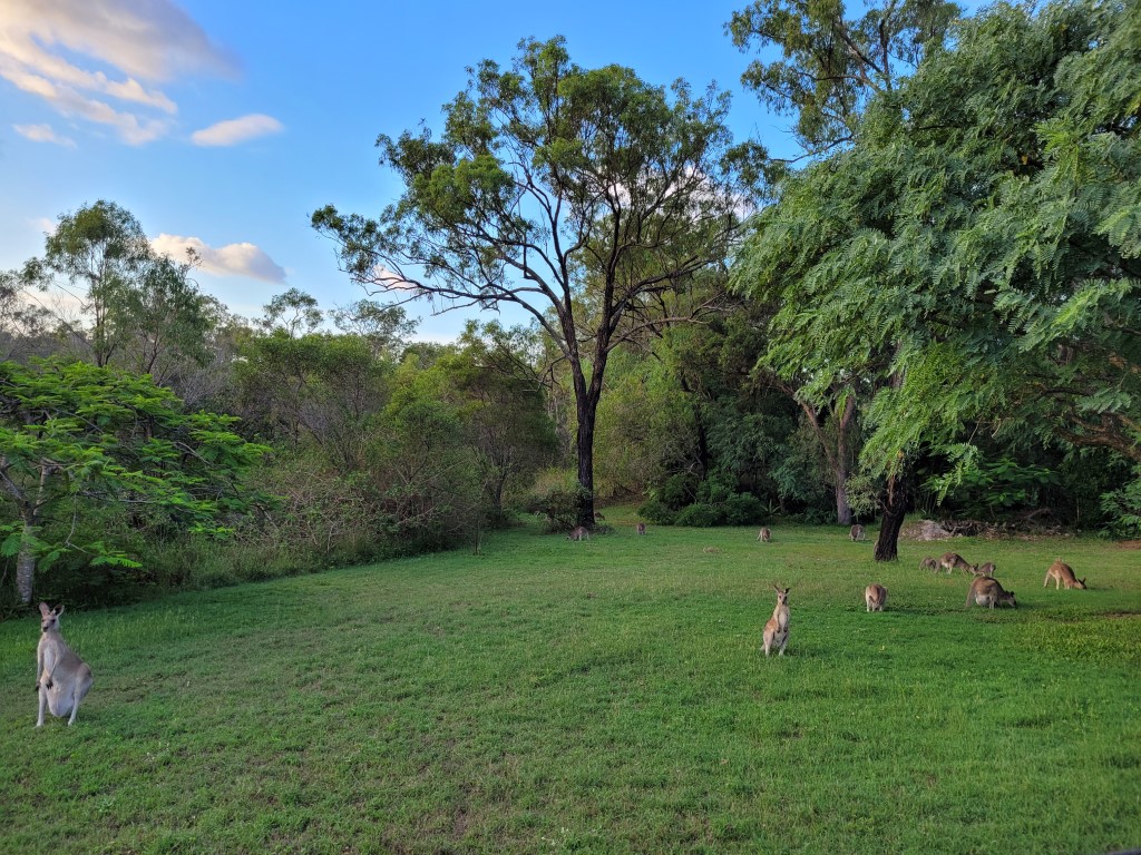 Der Sonnenaufgang war wunderschön. Die Roos konnten wir nochmal beim Frühstück sehen. Die Fahrt nach Emu Park war vier Stunden lang. Wir hatten uns ein Roadhouse auf der Strecke ausgesucht, um Pause zu machen, aber Rio hat noch geschlafen also dachten wir, wir können auch an der nächsten Tankstelle halten. Rio ist etwa 20 Km später wach geworden und hatte Hunger. Es kam natürlich erstmal keine Tanke. Rockhampton ist die nächste größere Stadt, von dort ist es auch nicht mehr so weit nach Emu Park. Endlich angekommen, waren die Kinderaugen groß. Es gibt ein Open Air Kino, ein riesiges Sprungtuch, Kettcars, Fahrräder, 2 Pools und jede Menge Platz zum Toben. Wir haben uns gleich mit einem Mann unterhalten, der mit seiner Familie (4 Söhne) das ganze Land bereist um ein neues zu Hause zu finden. Die Kinder wurden gleich eingeladen mit den Jungs zu spielen.