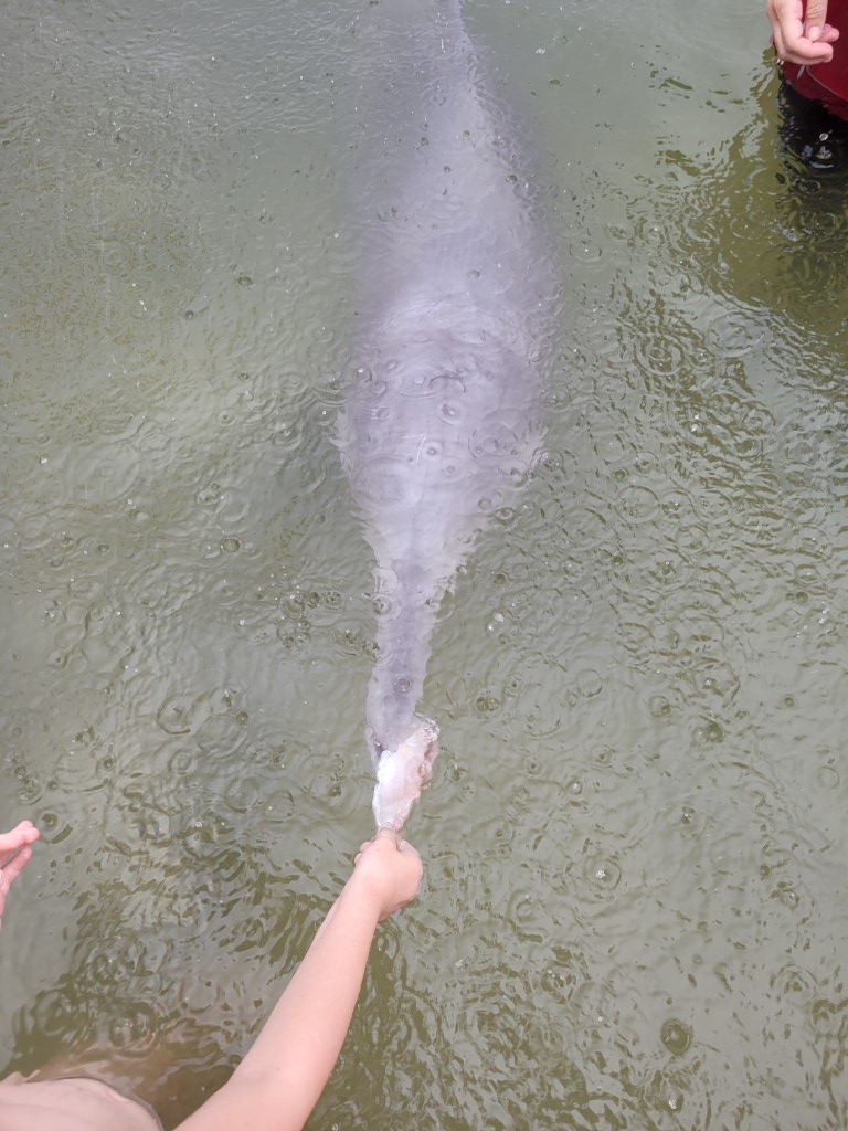 Es gibt fünf Delfine, die einmal am Tag in einem kleinen Zeitfenster gefüttert werden dürfen. Die Anzahl der Fische, die verfüttert werden, ist streng limitiert. Wir hatten heute Glück, und es war nicht zu viel los. Nachdem man sehr ausgiebig über die Delfine informiert wurde und die Hände desinfiziert hat, seine Schuhe abgegeben und die Token abgegeben hat, konnten wir uns endlich in die Warteschlange stellen. Gleich in den ersten Minuten hat es angefangen zu regnen. Als wir endlich an der Reihe waren, hat es in Strömen geregnet. Zum Glück hat uns die Familie gestern den Tipp gegeben, in Badekleidung zu gehen, das Wasser war für Erwachsene etwa hüfttief, nass wurden wir sowieso.