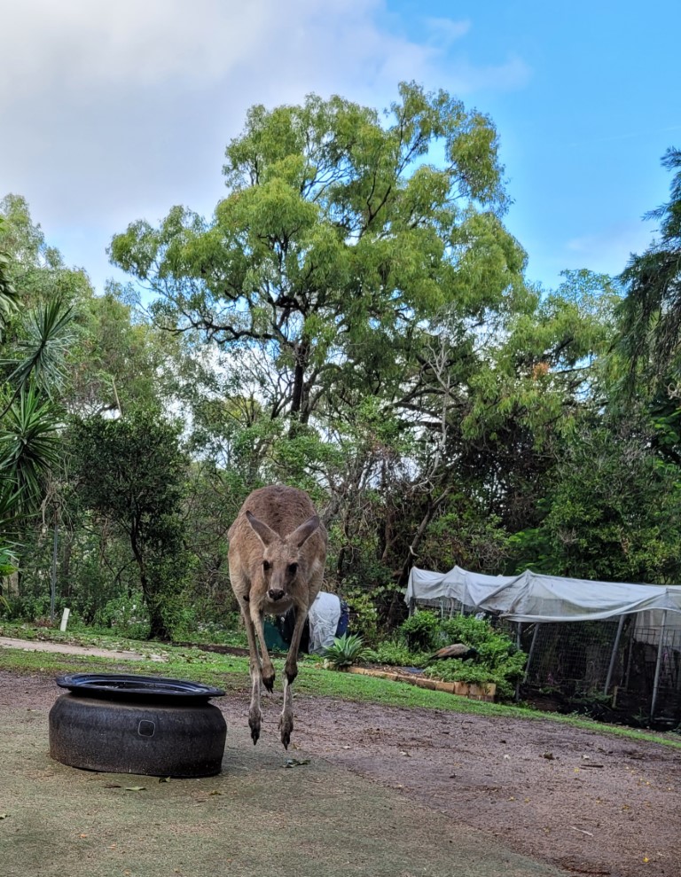 Den Platz haben wir als etwas größer (er hatte mal ca 15 Stellplätze) in Erinnerung, aber es war noch genug frei für uns. Der Besitzer ist sehr freundlich und hat gleich berichtet wie es ihm in den letzten Jahren ergangen ist. Leider gibt es hier keine Wallabies mehr und von den ehemals 80 Kängurus sind auch nur noch wenige übrig. Die Bevölkerungszahl hat sich hier verfünfacht und er hat Nachbarn mit Hunden bekommen. Der Zaun, den wir nicht kannten, wäre damit schon mal erklärt. Nur noch Übernachtungsgäste dürfen die Kängurus besuchen, oder wenn man sich vorher anmeldet. Vor Corona war es möglich, zur Fütterungszeit dabei zu sein.