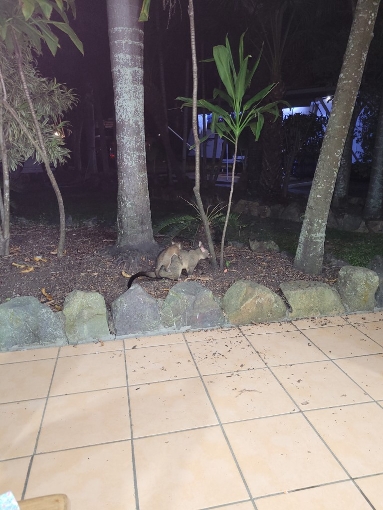 Mit dem Sonnenuntergang kommen die Roos hoch in den Vorgarten, wo Süßkartoffeln für sie bereit lagen. Die Tiere kamen und gingen, während man sich einiges über sie anhören konnte. Nach ein paar Minuten durfte man sich vorsichtig nähern und sie streicheln. Die Tiere waren sehr schreckhaft, allerdings bei Geräuschen aus den Büschen. Von den Besuchern haben sie sich nicht stören lassen. Mali möchte Tierärztin werden, das hat sie schon öfter gesagt, aber nachdem sie Delfine und Kängurus in freier Wildbahn gesehen hat, ist sie sich sicher. Rio ist trotz großer Begeisterung vorsichtig gewesen, er kennt das von unserer Katze. Die Tiere haben sich auch von ihm streicheln lassen.