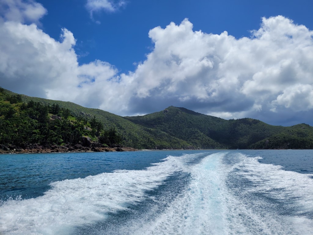 Morgens wurden wir von einem Shuttlebus eingesammelt und zur Marina gebracht, von wo wir unseren Ausflug zu den Whitsundays gestartet haben. Es gab Stingersuits für uns alle und danach ging der Spaß los.