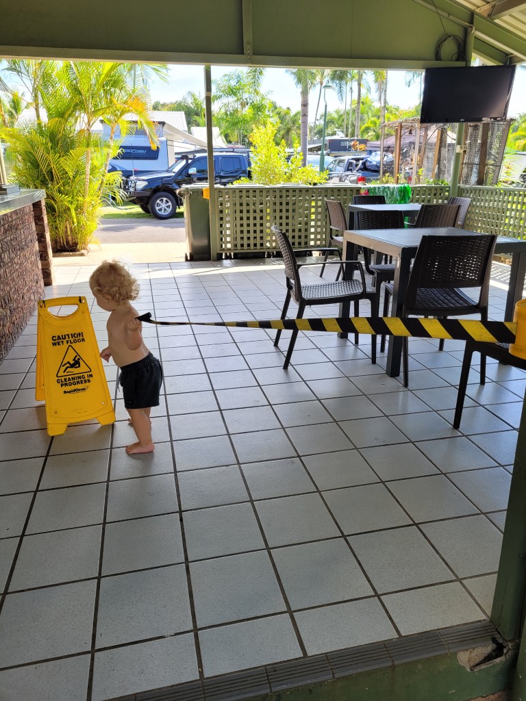 Bevor wir versucht haben uns richtig einzurichten, waren wir noch bei Aldi einkaufen. Australien ist generell teurer, aber bei Aldi war es erstmal vollkommen okay. Eingedeckt mit Gemüse und Salat haben wir unsere Unpowered Site bezogen. Die Kinder haben sich sofort eingesaut und sind schon mal mit Kleidung ins Wasser. Warum sie nicht nur in Unterwäsche gegangen sind? Sie wollten mal was Besonderes machen. Etwas ungünstig, denn die Wäscheleine ist schon mit Wäsche belegt, unter anderem allen T-Shirts, die Meru dabei hat. Es ist so warm, dass es auch ohne Shirt geht.