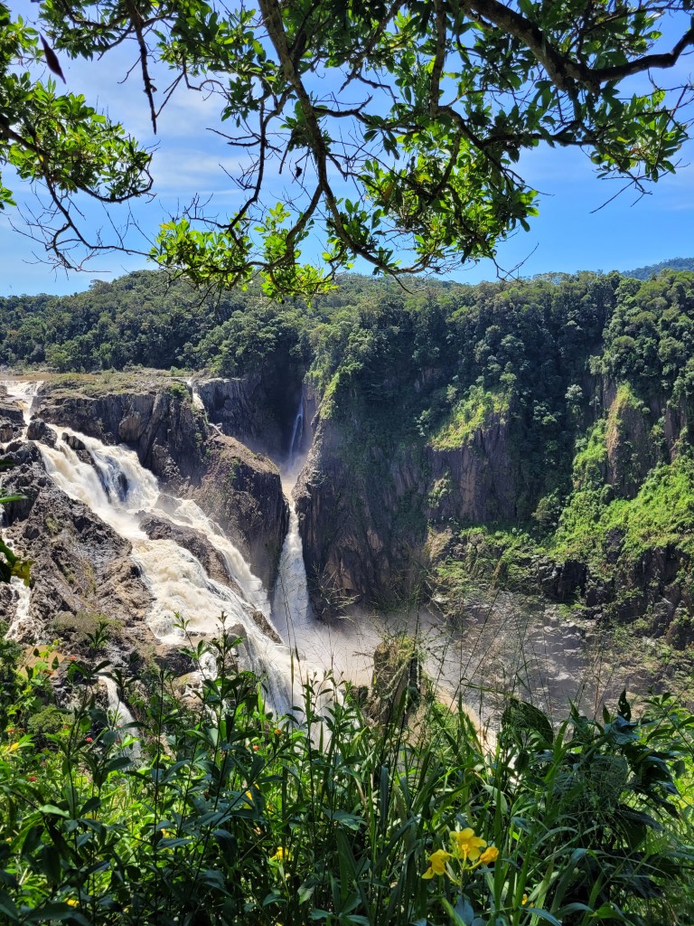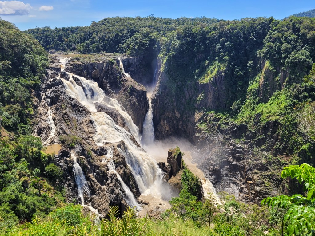 Die Anfahrt war sehr schön, dauerte aber eine Weile, weil die Straße über 40km entweder durch Kuhherden, enge Zuckerrohrplantagen oder noch engere Serpentienen führt. Bisher haben uns australische Wasserfällen nicht sehr beeindruckt, da sie meist sehr wenig Wasser führen. Der Umweg hat sich aber definitiv gelohnt. Die Aussicht war spektakulär, und der Wasserfall hat seinen Namen verdient. Die Aussichtsplattform ist über den Baumwipfeln und man kann im Schatten picknicken oder einfach die Aussicht genießen. Ein Wanderweg führt auch zum Fuße des Wasserfalls. Wer genug Zeit hat, sollte auf jeden Fall runterwandern. Der geteerte Weg ist sehr gut zu laufen und führt nicht durch dichtes Gestrüpp, sodass man auch barfuß laufen könnte. Wir haben viele bunte, vor allem blaue, Schmetterlinge gesehen und hatten den Weg für uns alleine.