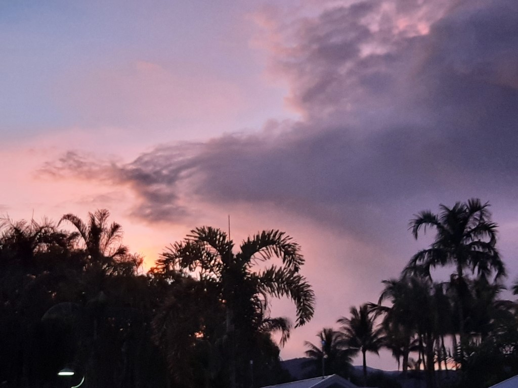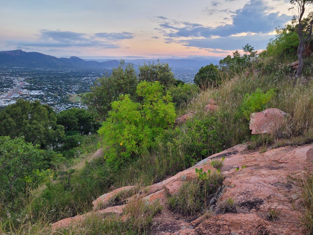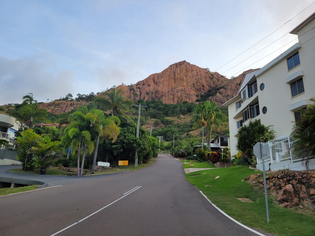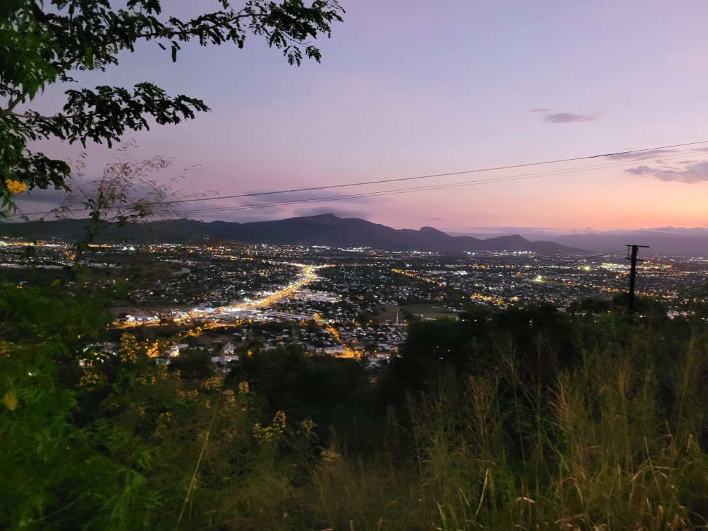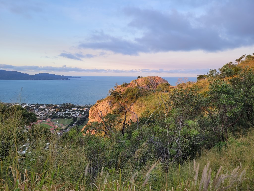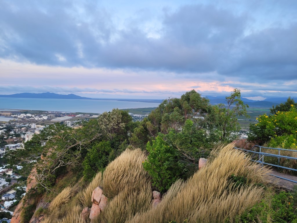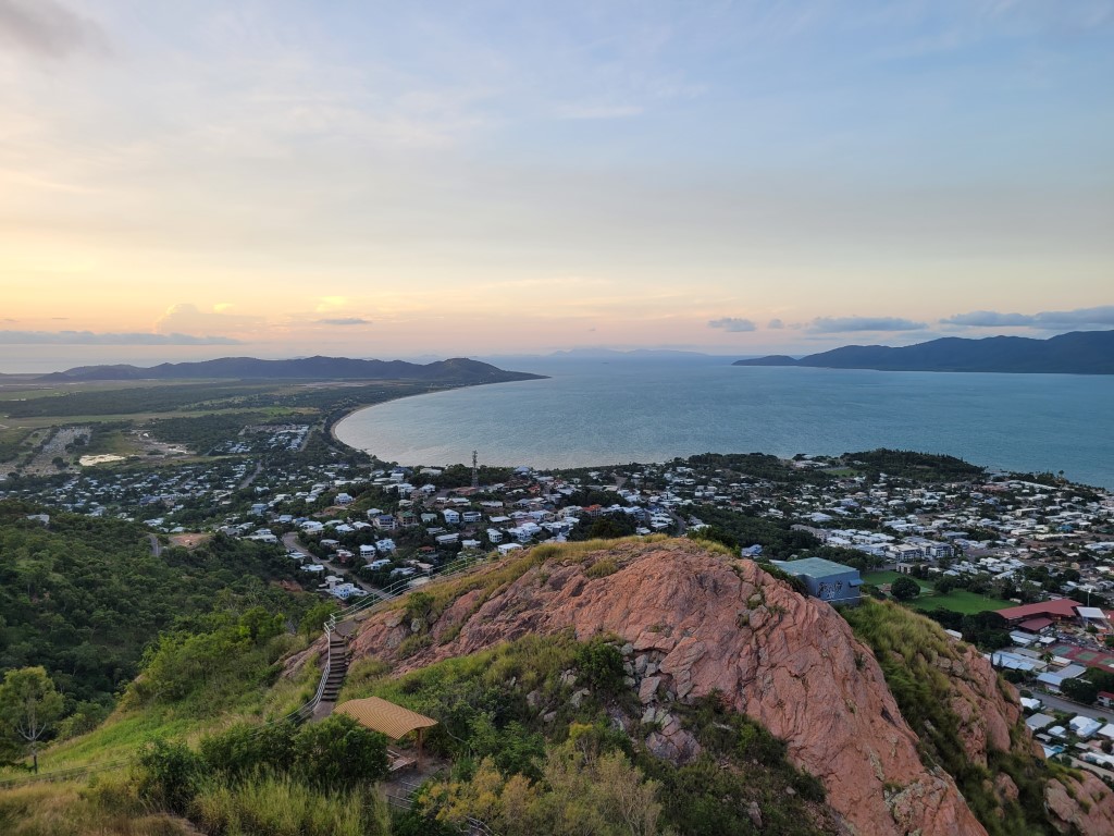 Ich hatte Kopfschmerzen und habe mich ausnahmsweise nicht danach gefühlt, Laufen oder Wandern zu gehen. Der Weg nach oben ist kurz vor Sonnenuntergang von Joggern und Fußgängern hoch frequentiert, und es tut etwas weh, im Auto sitzend an ihnen vorbeizufahren. Die haben sich die Aussicht richtig verdient. Heute zog es sich pünktlich um 18 Uhr zu und die Sonne versank in den Wolken, trotzdem war die Rundumsicht auf Townsville sehr schön. Überhaupt ist der Lookout (unserer Meinung nach) der schönste Ort von Townsville. Einen Ausflug nach Magnetic Island haben wir nicht gemacht, aber die Aussicht auf die Insel war auch schön.
