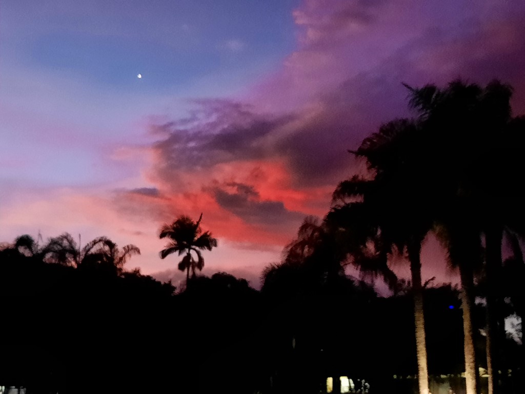 Steffen hat sich um das Essen gekümmert und ich mich um Rio und Mali, die wollten unbedingt in den Pool. Bei Sonnenuntergang im Pool zu sein hilft zumindest sich vor den möglichen Mücken zu schützen. Es war ein sehr schöner Abend. Der BBQ Duft kam rüber, der Pool schimmerte blau und im Hintergrund ging die Sonner unter und der HImmel war lila. Der Mond und die Sterne waren zu sehen, und zwei Flughunde sind immer mal durch das Bild geflogen.