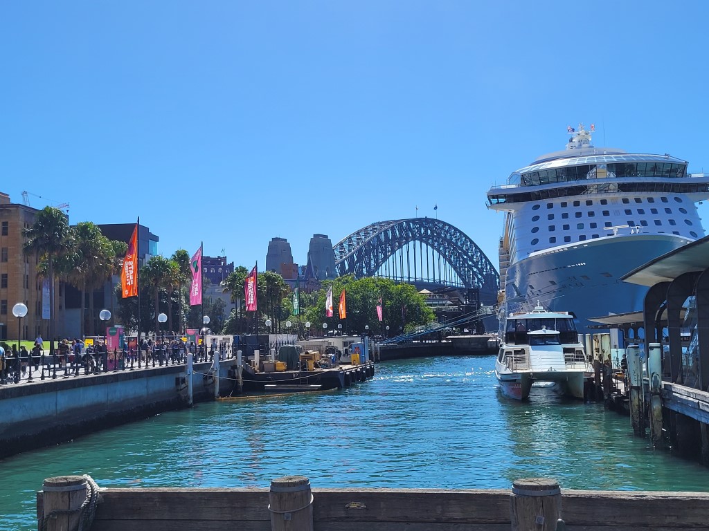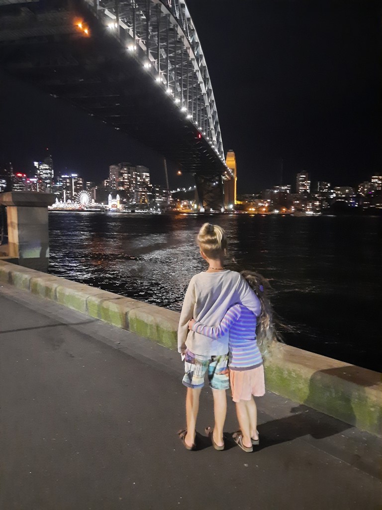 Für die späte Anreise gestern waren wir recht früh auf den Beinen. Man merkt, dass man in einem Hostel ist. Es ist zwar ein Familienzimmer, aber um uns herum war es ab 6 Uhr laut, weil die Türen der Zimmer geräuschvoll ins Schloss fallen und das Gebäude echte Holzböden hat, die ihren Charakter haben. Stört uns heute nicht, wir haben viel vor und keine Zeit zu verlieren. Zunächst wollten wir frühstücken. Es gibt eine große Küche, das Buffet war uns zu teuer. Direkt vor dem Hostel gibt es einen Minimarkt, für 2x Cornflakes und 2l Milch haben wir letztlich auch fast 30 Dollar gezahlt. Nachdem wir unser Geschirr abgewaschen hatten, haben wir gesehen, dass es in der Küche Regale gibt in denen Lebensmittel „for free“ sind. Morgen wissen wir jedenfalls wo, wir was frühstücken. Wir wohnen direkt auf „The Rocks“ und sind durch kleine Gässchen in Richtung Hafen und dabei an einem kleinen Markt vorbei gekommen. Die Ecke hat kleine verwinkelte Gässchen mit Restaurants und Cafés. Die Sicht auf die Oper war leider durch ein riesiges Passagierschiff versperrt. Das hatte ich mir anders vorgestellt. Wir sind an den Werften vorbeispaziert und zur Oper gelaufen. Auch der große Platz vor der Oper ist gerade eine Baustelle und es sieht leider nicht ganz so hübsch aus. Nach etwas Sightseeing sind wir mit der Fähre nach Manley gefahren. Die Cornflakes haben nicht lange gehalten und wir haben ausnahmsweise zu Mittag gegessen, bevor es kurz an den Strand ging. Am Strand war viel los, obwohl es sehr windig und frisch war. In der best bewerteten Eisdiele gabe es noch ein Eis, die Kinder haben sich auf dem Spielplatz vergnügt und dann ging es auch schon mit der Fähre zurück. Irgendwie hat das alles so lange gedauert, dass wir sowohl den Sonnenuntergang verpasst haben als auch die „Sonderbeleuchtung“ der Oper. Samstags gibt es im Hafen ein kleines Feuerwerk, welches wir uns von unserer Herberge aus anschauen wollten. Es war noch genug Zeit zum Schlendern und wir sind den Hafen nochmal in die andere Richtung abgelaufen und sind unter der Habour Bridge durchgelaufen (darüber laufen kostet 380 Dollar pro Person). Das Passagierschiff hat genau nach unserer Rückkehr abgelegt und die Sicht auf die Oper freigegeben. Um 20 Uhr ging plötzlich ein Feuerwerk für 1 Minute los und wir waren ewig weit entfernt. Eigentlich soll es um 21 Uhr losgehen. Zurück auf der schönen Dachterasse haben wir die Kinder noch wachgehalten, damit sie das Feuerwerk nicht verpassen. Leider war es entweder zu windig oder es waren die 5 Knaller um 20 Uhr, aber wir sind ohne Lichterspektakel, dafür mit bester Aussicht ins Bett. Wir waren bestimmt 10 km zu Fuß unterwegs und haben sehr viel gesehen. Morgen haben wir noch Zeit in den Park zu gehen, aber für Sydney sollte man sich mindestens 3 Tage einplanen und möglichst einen Wochenendtag damit man die Extraveranstaltungen wie z.B. den Wochenmarkt sehen kann.