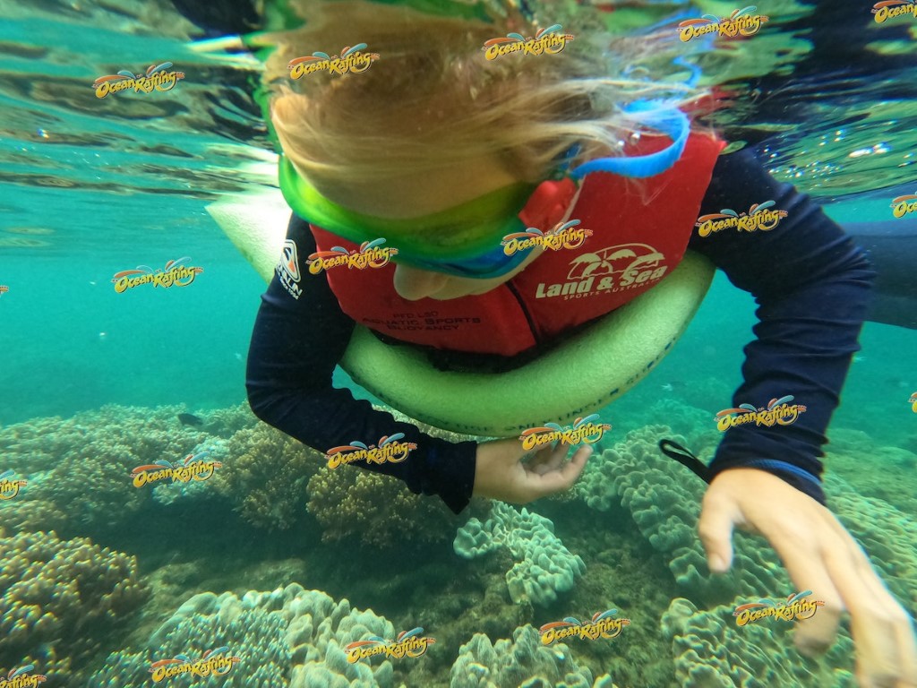 Ich war mit den beiden Kindern im Wasser. Die Ausrüstung war so viel besser als auf Bali! Es gab kleine Kinderschwimmwesten und Poolnudeln (für jeden, der wollte) und die Schnorchelausrüstung war auch für kleine Gäste vorhanden. Nachdem wir an einem super Teil des Korallenriffs abgesetzt wurden bin ich von dort mit den Kindern alleine weiter. Wir haben viele tolle Korallen gesehen, in allen Farben und riesengroß. Natürlich gab es auch tolle bunte Fische, aber sie hatten in den Korallen viel Platz um sich zu verstecken. Teilweise war es sehr bewölkt und man hat erst wieder richtig gut gesehen, wenn die Sonne aufs Wasser geschienen hat.