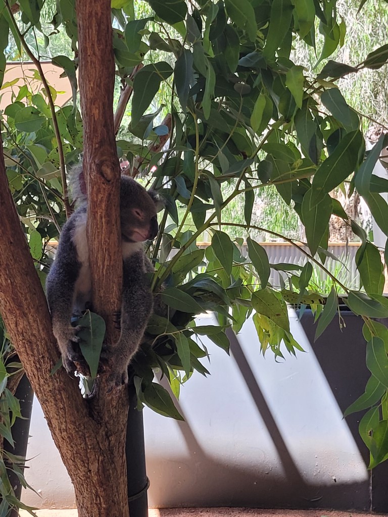 Heute ist ein Ausflug für die Kinder zu einem Tierpark geplant, damit wir überhaupt einen Koala sehen. Der Eintritt lag für uns alle bei 130 Dollar, was für australische Verhältnisse nicht viel ist. An der Kasse haben wir dann erfahren, dass das Streicheln und Fotografieren mit den Koalas nochmal extra kostet und zwar 30 Dollar pro Person. Mali hat sich das Koalastreicheln zu Ostern gewünscht und wir haben uns in die kleine Schlange gestellt. Als wir an der Reihe waren, wurde uns gesagt, dass die Kinder zu klein sind. Kurz Streicheln und dabei fotografiert werden für 22 Dollar wäre möglich. Wenigstens beide Kinder konnten sich gleichzeitig hinstellen und den Koala streicheln, aber nach etwa 30 Sekunden war der Spaß schon vorbei. Wir haben beim Ausgang leider vergessen unsere Fotos mitzunehmen (die hätte man dort erst kaufen müssen).