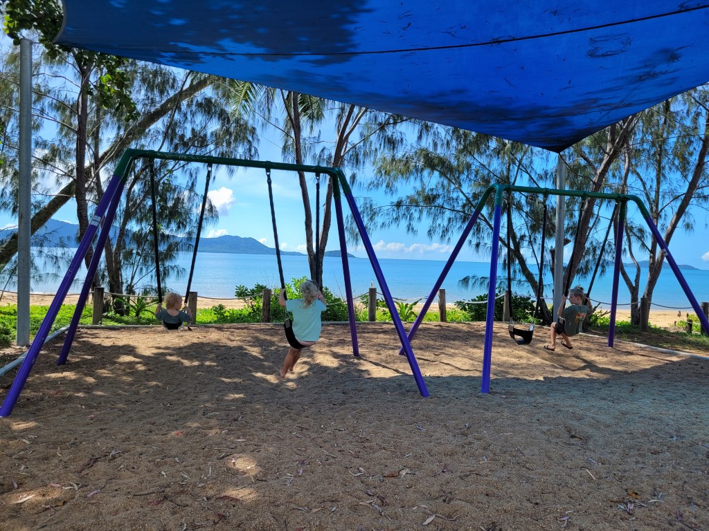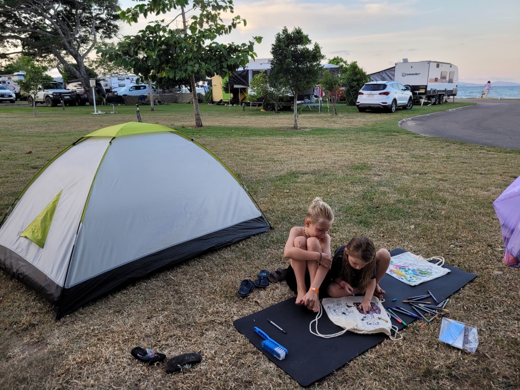 Der Abschied aus Airlie fiel schwer, wir hätten bestimmt noch ein paar Wanderungen in der Umgebung machen können, aber in Townsville gibt es bestimmt auch etwas zu entdecken. Die Fahrt war eher öde und zog sich. Der Stellplatz war nicht schön. Man hört die Hauptstraße, um uns herum war dichtes Gestrüpp, die Küche und der Pool sind ewig weit weg. Der Platz war bei Weitem nicht ausgebucht, aber irgendwie sind die besseren Plätze wohl für Wohnwagen reserviert. Zum Glück haben wir einen Platz auf dem Kunstrasenstreifen bekommen. Warum auch immer, wäre der 20 Dollar teurer gewesen, aber wir mussten keinen Aufpreis zahlen. Mali und Meru haben sofort 10 Kinder zum Spielen gefunden und auch Rio konnte mit seinem Ball spielen, ohne dass man Angst haben musste, dass er ins Gestrüpp klettert. Das neue Küchenhaus haben wir ausgenutzt und sind in den klimatisierten Raum geflüchtet, um uns vor den Stechviehchern zu schützen (zu dem Zeitpunkt wussten wir noch nicht, dass sie uns schon auf dem Kunstrasen erwischt hatten). Im Camper stand die Hitze und es war fast unerträglich warm. Steffen ist zeitweise in die Küche auf die Couch gezogen, ich habe Rio mit einem nassem Handtuch abgekühlt und Ventilator gespielt.