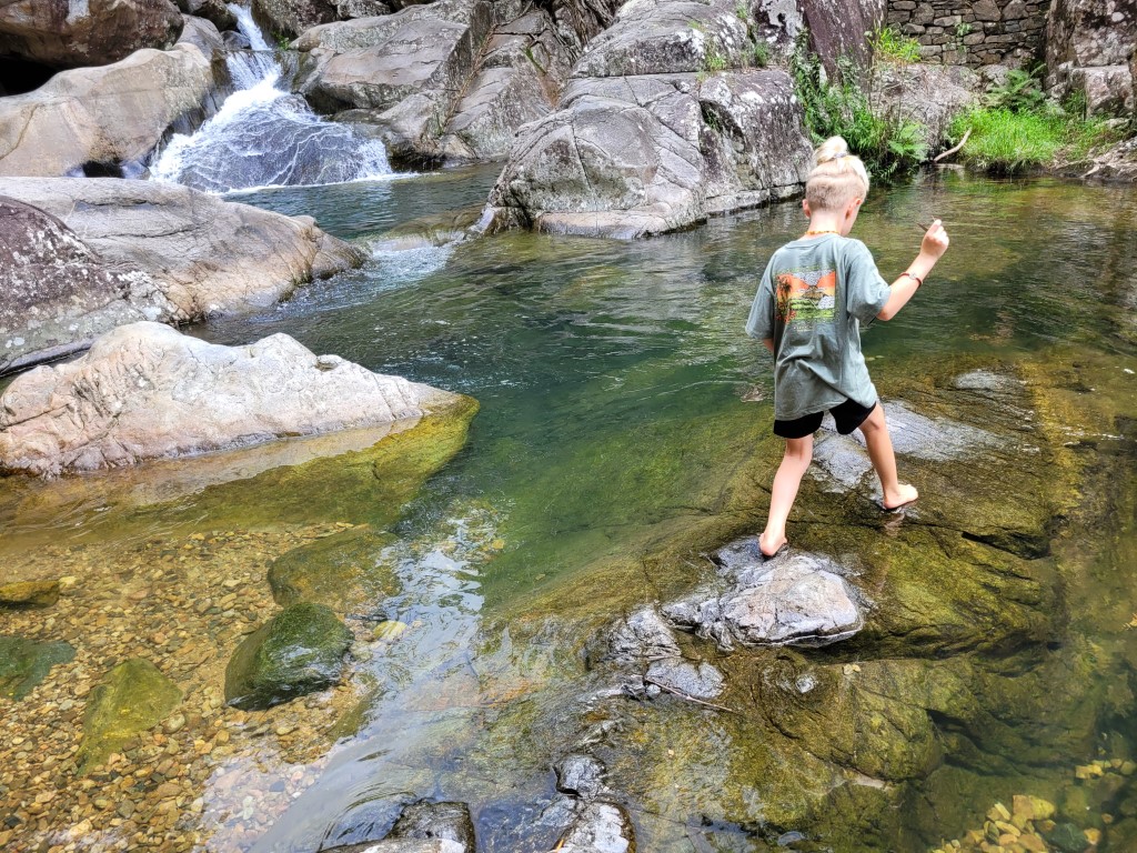 Unser Stellplatz ist groß und die nächsten Nachbarn sind weiter weg. Wir wurden gleich von Vögeln begrüßt, die uns angefaucht haben. Es war so warm und wir sind sofort in den Pool. Sogar Rio wollte auf die Wasserrutschen und hatte Spaß daran, mit uns zu rutschen.