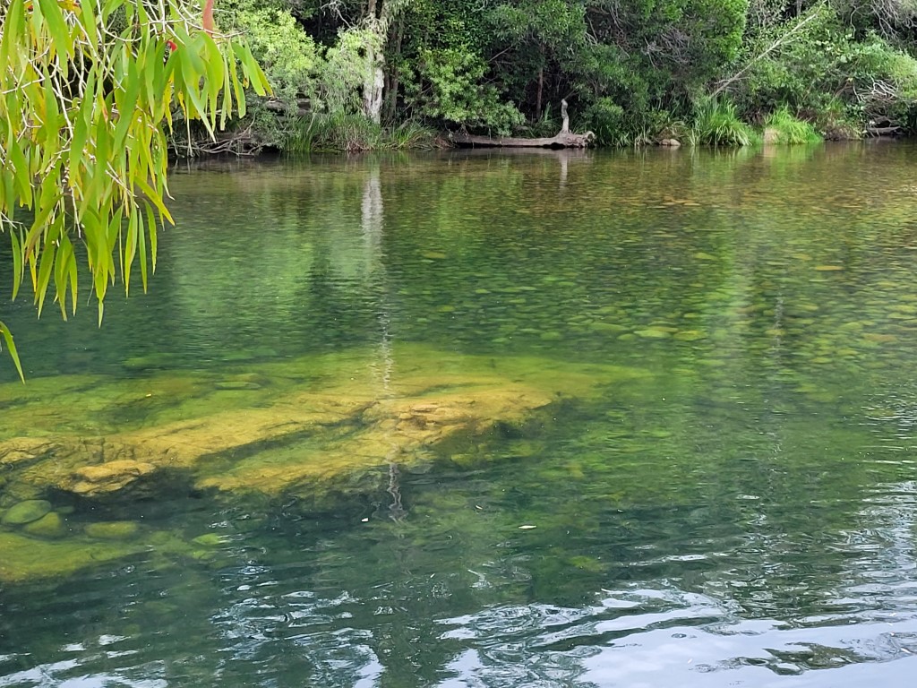Das große Ziel für heute war der Big Crystal Creek, wo wir zum Baden hingefahren sind. Wir waren schon zwei Mal hier und es war auch das dritte Mal wunderschön, obwohl es anfing zu regnen als wir ankamen. Das Wetter hat uns nicht davon abgehalten, wenigstens kurz baden zu gehen. Mali und Meru sind sogar von den Felsen ins Wasser gesprungen. Die Farben und das absolut klare Wasser sind unglaublich, selbst im tiefen Wasser kann man die Fische mit bloßem Auge von der Wasseroberfläche aus sehen.