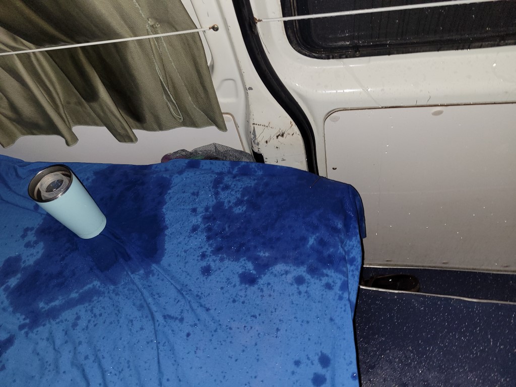 In der Nacht hat es angefangen zu regnen. Innerhalb weniger Sekunden war alles nass, vor allem unsere Betten. Sowohl der Camper als auch das Zelt sind undicht. Dazu kam eine unglaubliche Hitze, die mit der Luftfeuchtigkeit von 99% zusammen unseren Bus in ein Dampfbad verwandelt hat. Es fiel allen schwer, nochmal einzuschlafen. Früh morgens haben wir gleich unsere Bettwäsche in den Trockner geworfen, alles andere musste nass eingepackt werden, da es heute weiter geht.
