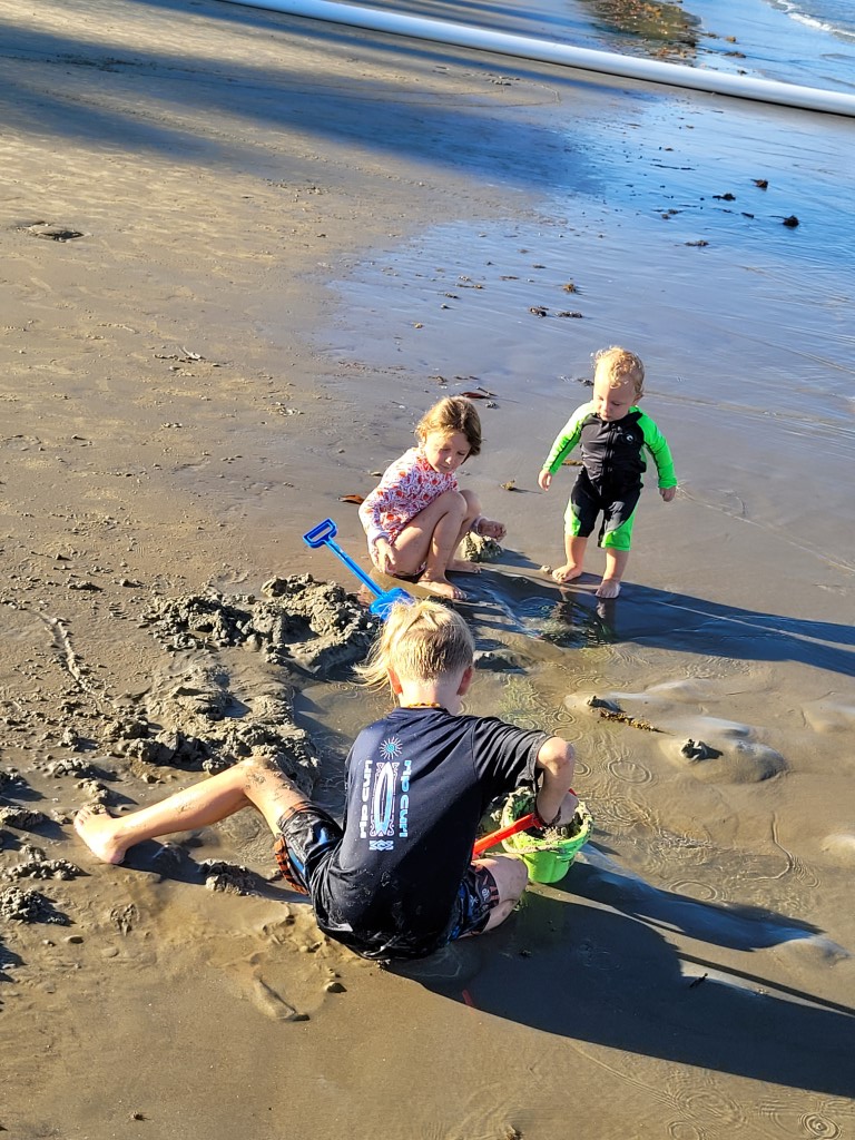 Abkühlen ist völlig übertrieben, die Wassertemperatur liegt über der meines Badewassers daheim. Das Wasser war auf jeden Fall wärmer als die Lufttemperatur und die lag heute bei 33°C. Besonders warm ist es, weil man sich noch Langarm-UV Kleidung überzieht, um keinen Sonnenbrand zu bekommen. Die Kinder hatten trotzdem Spaß und haben den Strand umgegraben.