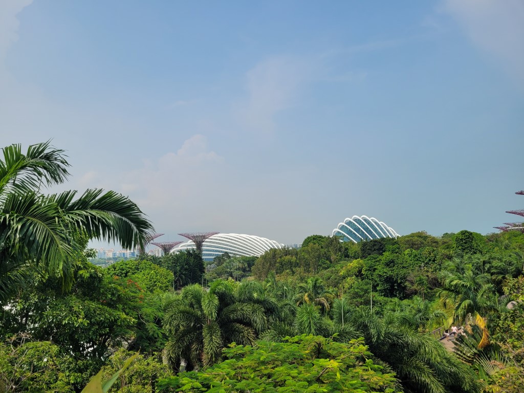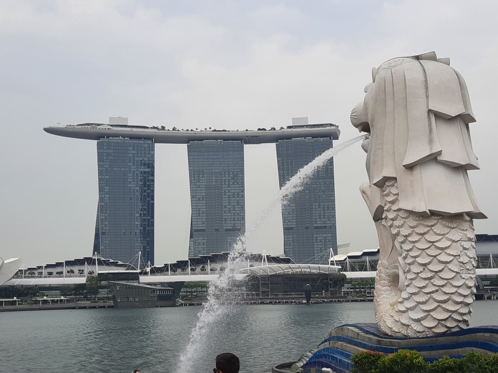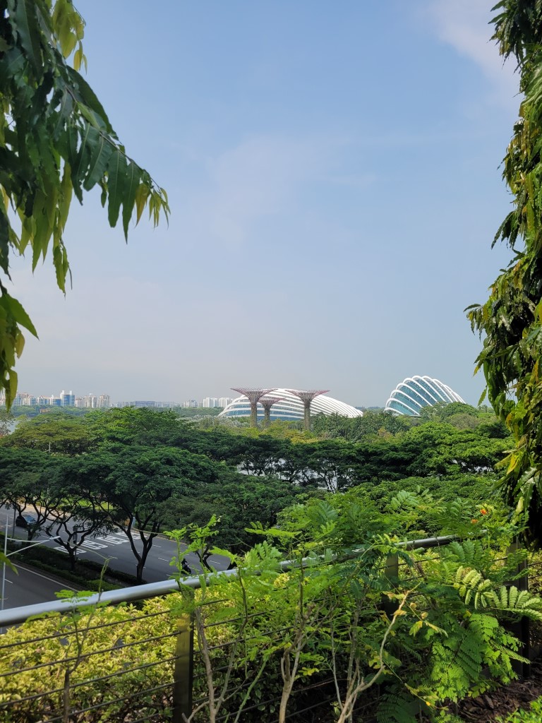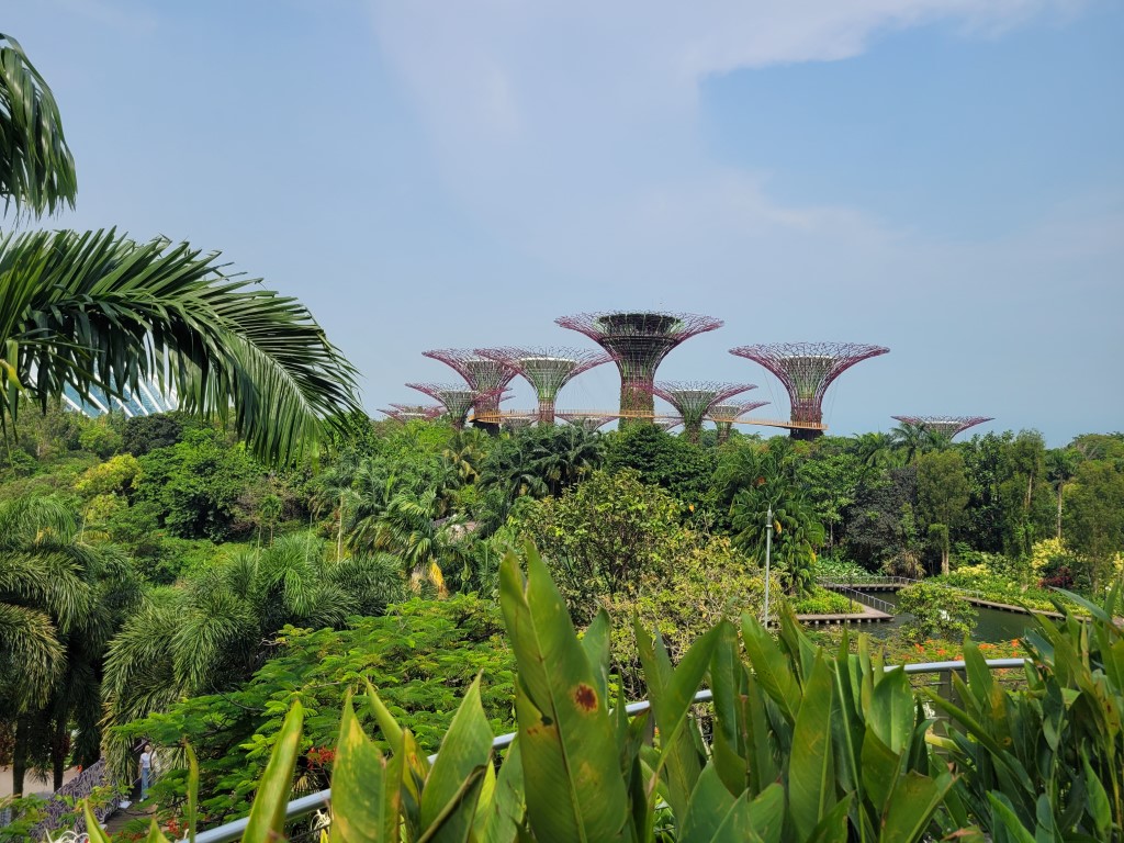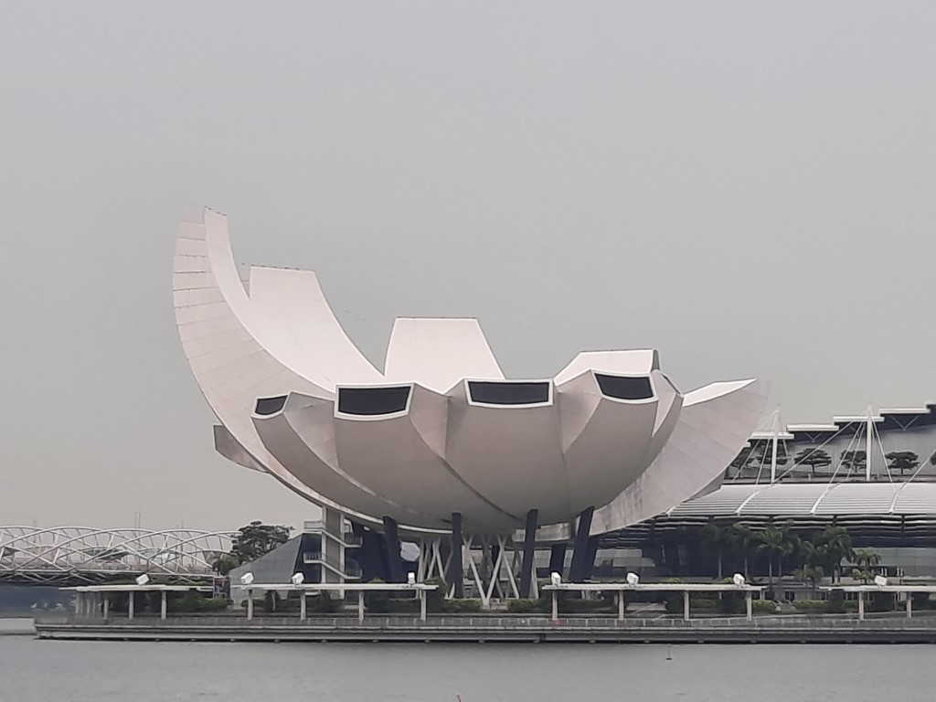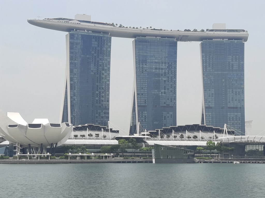 Morgens war erstmal die Frage, wo wir etwas Bezahlbares frühstücken können. Wir haben mal vorsichtig in unserem Hotel gefragt, und es war für diese Verhältnisse vollkommen gut, Kinder müssen nichts zahlen. Für 28 Euro sind wir alle satt geworden und hatten auch noch eine große Auswahl, ausserdem konnten wir uns noch Äpfel für den Tag einstecken. Wir sind erstmal zu Fuß los, auch wenn die Metro günstig ist und alle 5 Minuten fährt. Wir sind am Fluss entlang gelaufen und kamen damit an einigen Sehenswürdigkeiten vorbei. An ClarkeQuay war leider eine Riesen-Baustelle und ansonsten „tote Hose“, wahrscheinlich waren wir zu früh da. Die bunten Häuserfassaden konnte ich leider nicht gut fotografieren. Die Wege waren fast menschenleer, alles war aufgeräumt und hübsch. Am Fullerton Hotel gab es verschiedene Wege, um ans Wasser zu gelangen, wo man einen guten Blick auf das berühmte Hotel und das Museum hat. Wir hatten verschiedene Ideen, z.B. in das Museum zu gehen, allerdings war die aktuelle Austellung (wahrscheinlich) nicht unser Geschmack. Für manche Spaß-Attraktionen wie den Bouncing-Net-Garden muss man mindestens 1,30 Meter groß sein und das Eiscreme-Museum war leider auch nichts für uns. Nach längerem Suchen haben wir den Eingang zum Hotel und dessen Aufzug zur Aussichtsplattform gefunden, an der Kasse sind wir umgekehrt und haben beschlossen das Geld lieber in gutes Essen zu investieren. Tatsächlich haben wir sehr leckere Tees mit Obst darin gehabt. Wir sind von der Helixbrücke die Bucht abgelaufen, durch das Marinabay Hotel und über die Brücke zu den Gardens by the Bay gelaufen. Der Garten ist sehr schön angelegt, aber die künstlichen Bäume wirken seltsam, wenn man zuvor schon im Dschungel war und unfassbar viele exotische Pflanzen gesehen hat. Abends muss man aber auf jeden Fall zu den künstlichen Bäumen und sich die Lichtershow anschauen.
