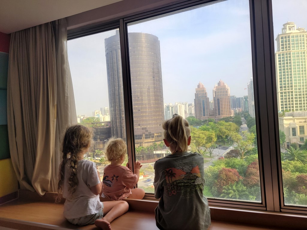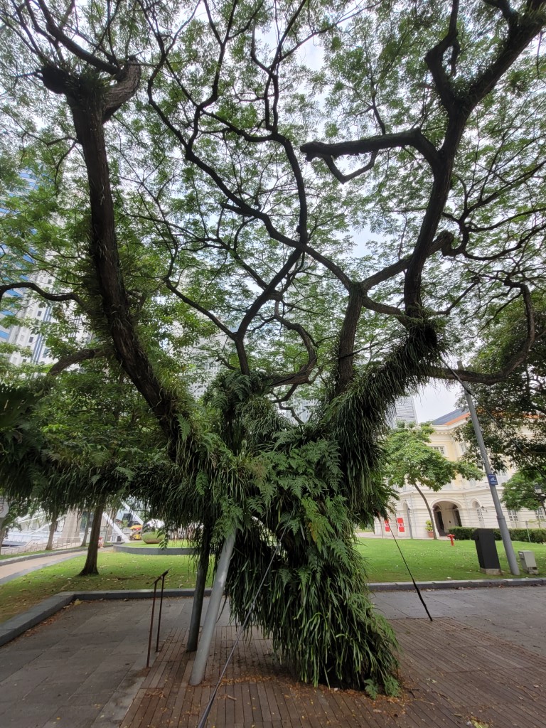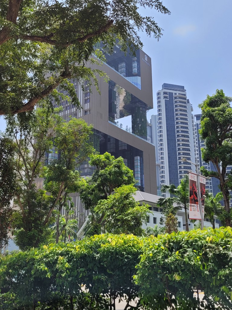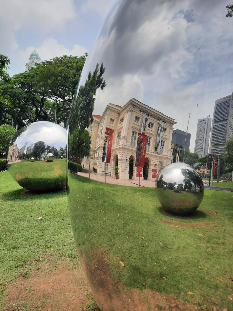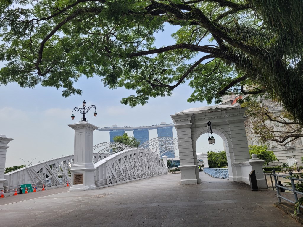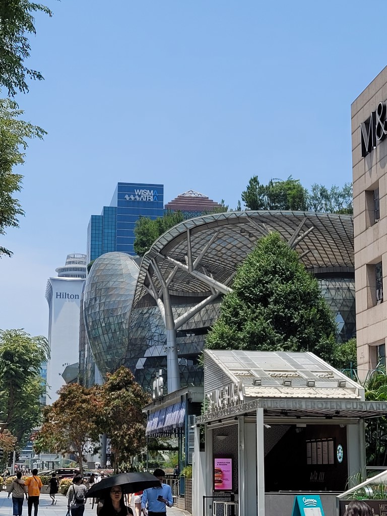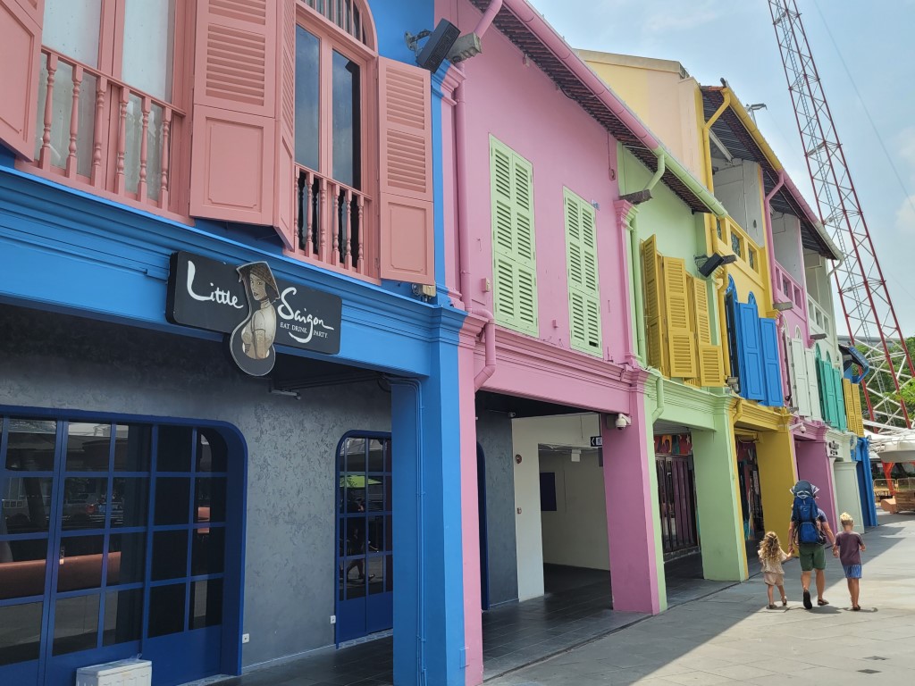 Morgens war erstmal die Frage, wo wir etwas Bezahlbares frühstücken können. Wir haben mal vorsichtig in unserem Hotel gefragt, und es war für diese Verhältnisse vollkommen gut, Kinder müssen nichts zahlen. Für 28 Euro sind wir alle satt geworden und hatten auch noch eine große Auswahl, ausserdem konnten wir uns noch Äpfel für den Tag einstecken. Wir sind erstmal zu Fuß los, auch wenn die Metro günstig ist und alle 5 Minuten fährt. Wir sind am Fluss entlang gelaufen und kamen damit an einigen Sehenswürdigkeiten vorbei. An ClarkeQuay war leider eine Riesen-Baustelle und ansonsten „tote Hose“, wahrscheinlich waren wir zu früh da. Die bunten Häuserfassaden konnte ich leider nicht gut fotografieren. Die Wege waren fast menschenleer, alles war aufgeräumt und hübsch. Am Fullerton Hotel gab es verschiedene Wege, um ans Wasser zu gelangen, wo man einen guten Blick auf das berühmte Hotel und das Museum hat. Wir hatten verschiedene Ideen, z.B. in das Museum zu gehen, allerdings war die aktuelle Austellung (wahrscheinlich) nicht unser Geschmack. Für manche Spaß-Attraktionen wie den Bouncing-Net-Garden muss man mindestens 1,30 Meter groß sein und das Eiscreme-Museum war leider auch nichts für uns. Nach längerem Suchen haben wir den Eingang zum Hotel und dessen Aufzug zur Aussichtsplattform gefunden, an der Kasse sind wir umgekehrt und haben beschlossen das Geld lieber in gutes Essen zu investieren. Tatsächlich haben wir sehr leckere Tees mit Obst darin gehabt. Wir sind von der Helixbrücke die Bucht abgelaufen, durch das Marinabay Hotel und über die Brücke zu den Gardens by the Bay gelaufen. Der Garten ist sehr schön angelegt, aber die künstlichen Bäume wirken seltsam, wenn man zuvor schon im Dschungel war und unfassbar viele exotische Pflanzen gesehen hat. Abends muss man aber auf jeden Fall zu den künstlichen Bäumen und sich die Lichtershow anschauen.