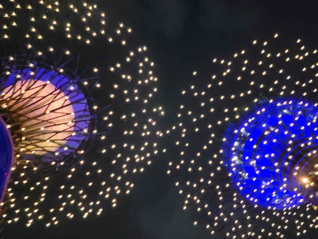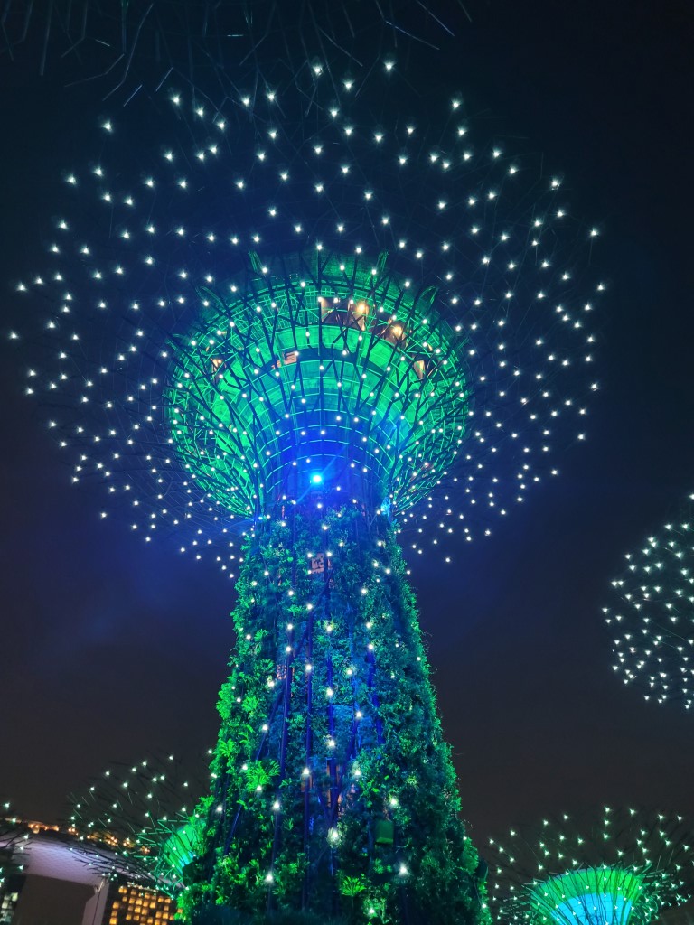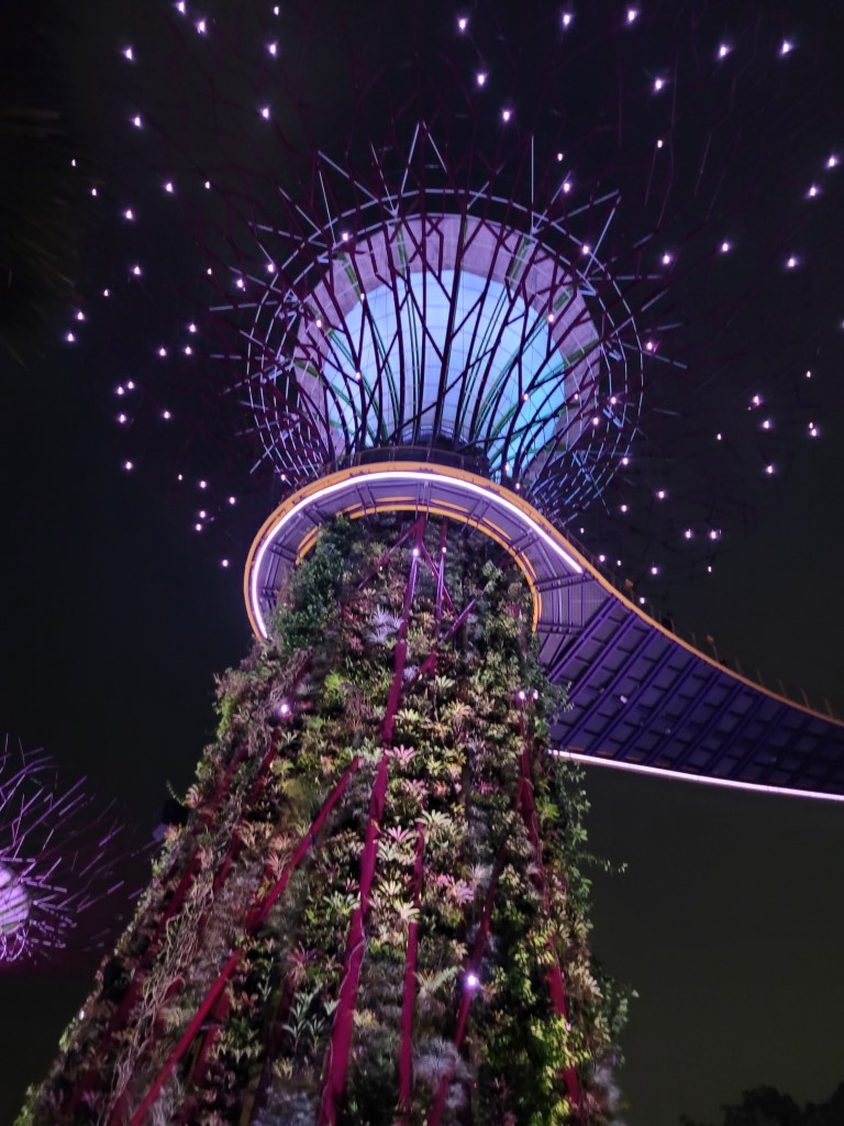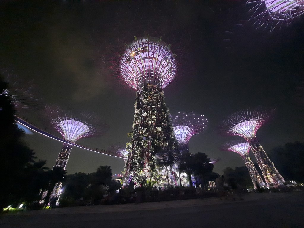 Heute ist die einzige Chance die Show zu sehen und eigentlich haben wir den ganzen Tag darauf gewartet, und wir konnten uns einen Ruck geben. Die Kinder waren gar nicht begeistert sind aber ohne Jammern mitgekommen. Immerhin kannten wir einen Weg der direkt (denken wir) zur Metro geführt hat. Irgendwie sind wir eine Station zu früh ausgestiegen und mussten aus einer sehr verlassenen Gegend noch bis zu den Gärten laufen, aber so kennt man das von uns ja schon. Wenn man nicht an den Touristenattraktionen ist, ist auch plötzlich nicht mehr alles detailiiert ausgeschildert, und wir wussten nicht, wo der beste Eingang und der kürzeste Weg zum Ort des Geschehens ist. Ist das am Hauptbaum? Wir gehen mal davon aus. Verdächtig wenige Leute hier, dafür dass das Highlight der Stadt in ein paar Minuten beginnt. Kurz darauf hatten wir ein paar Follower, die wohl dachten, wir kennen uns aus. Fünf Minuten vor Beginn haben wir den „Hauptbaum“ erreicht und hier waren auch einige Menschen versammelt, wir haben es wohl gefunden. Schnell noch einen Platz unter den Ästen gesucht, also einfach auf den Betonboden gelegt und los ging es.