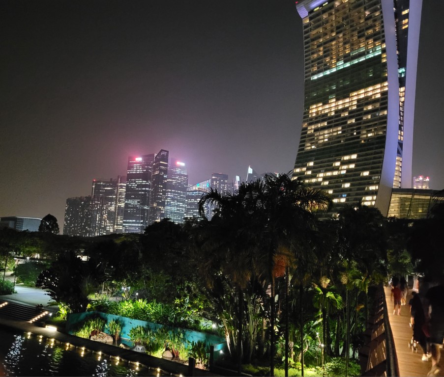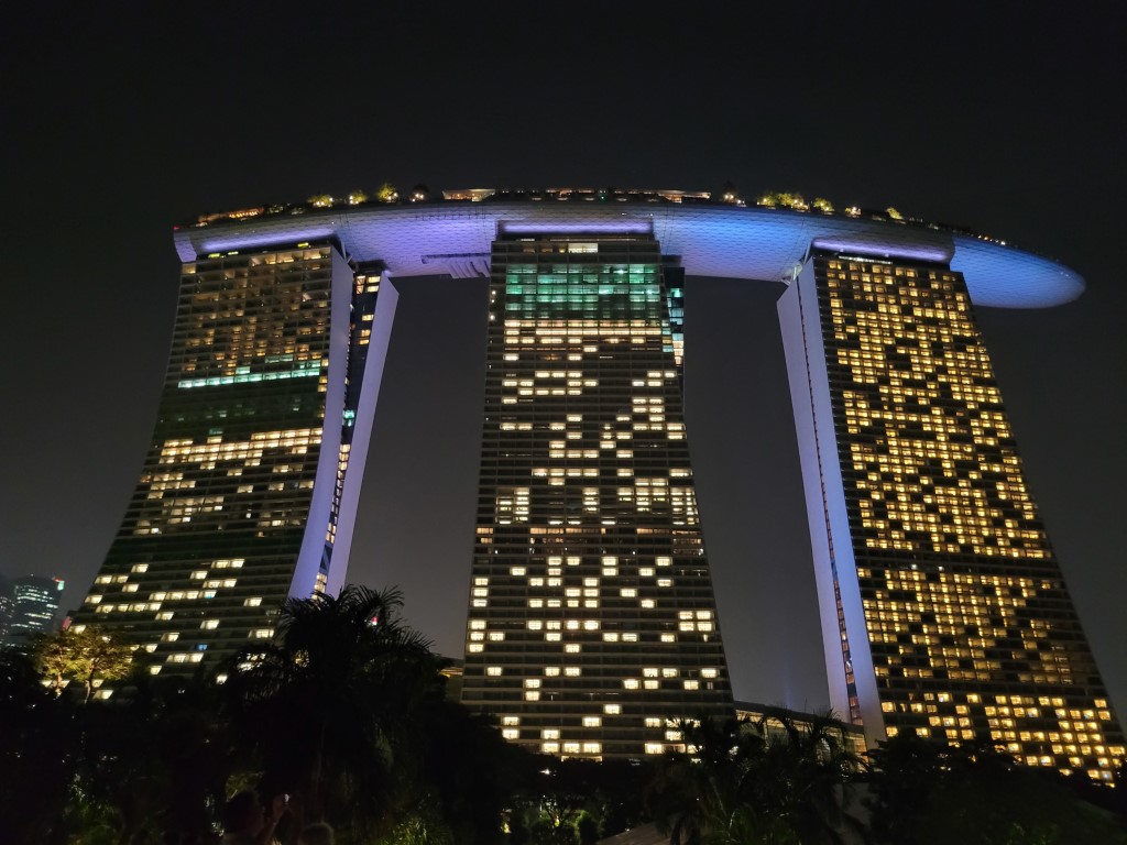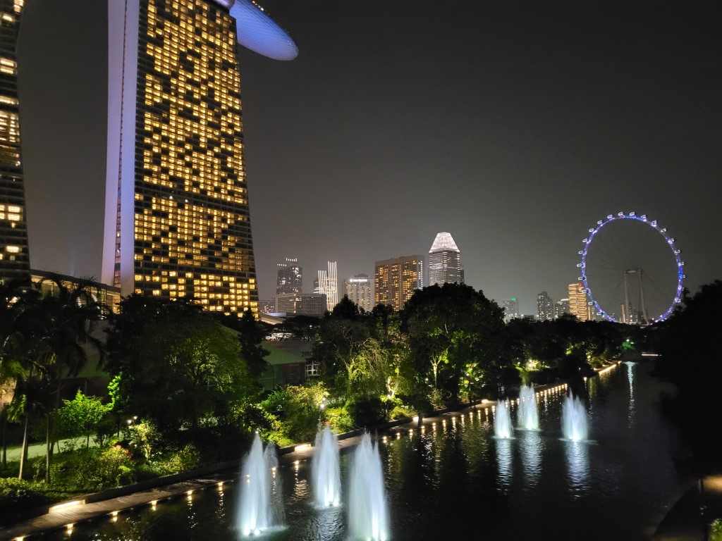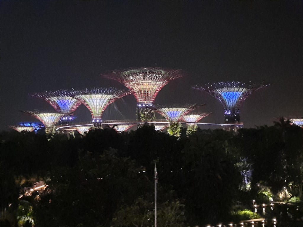 Auf die Show zu warten hätte in unserem Fall bedeutet, dass wir dreieinhalb Stunden warten müssen und es lagen schwere, dunkle Wolken in der Luft. Luft, die man schneiden konnte. Uns war zu warm, und wir waren mittlerweile fußlahm. Wir haben beschlossen, nochmal am Hotel in den Pool zu springen, etwas zu essen und dann nochmal mit der Metro zu den Gardens by the Bay fahren.